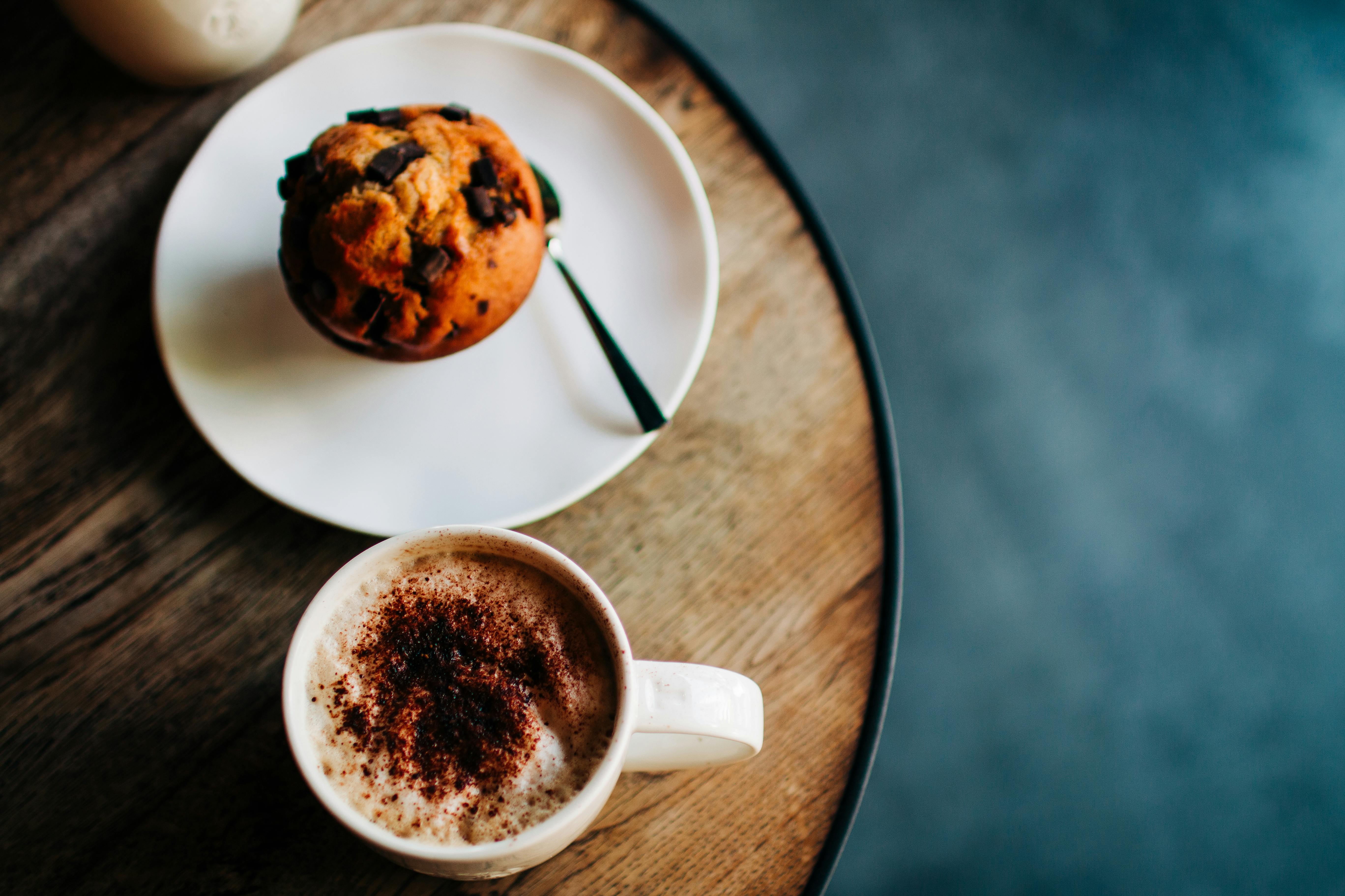 A top view of a chocolate muffin and coffee on a rustic table, creating a cozy café vibe.