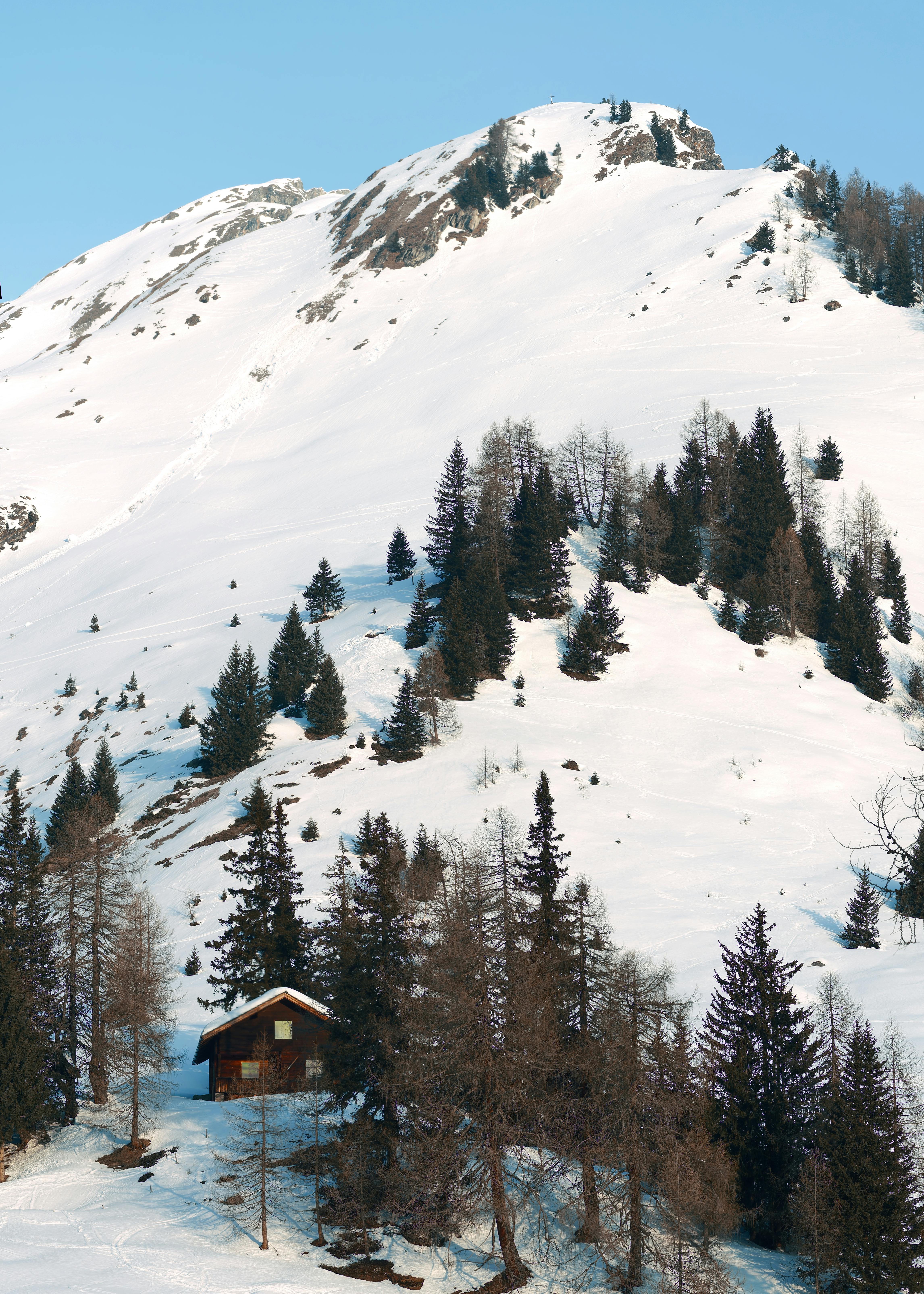 Snow-covered mountain scene with a cozy cabin and evergreen trees in Carinthia, Austria.