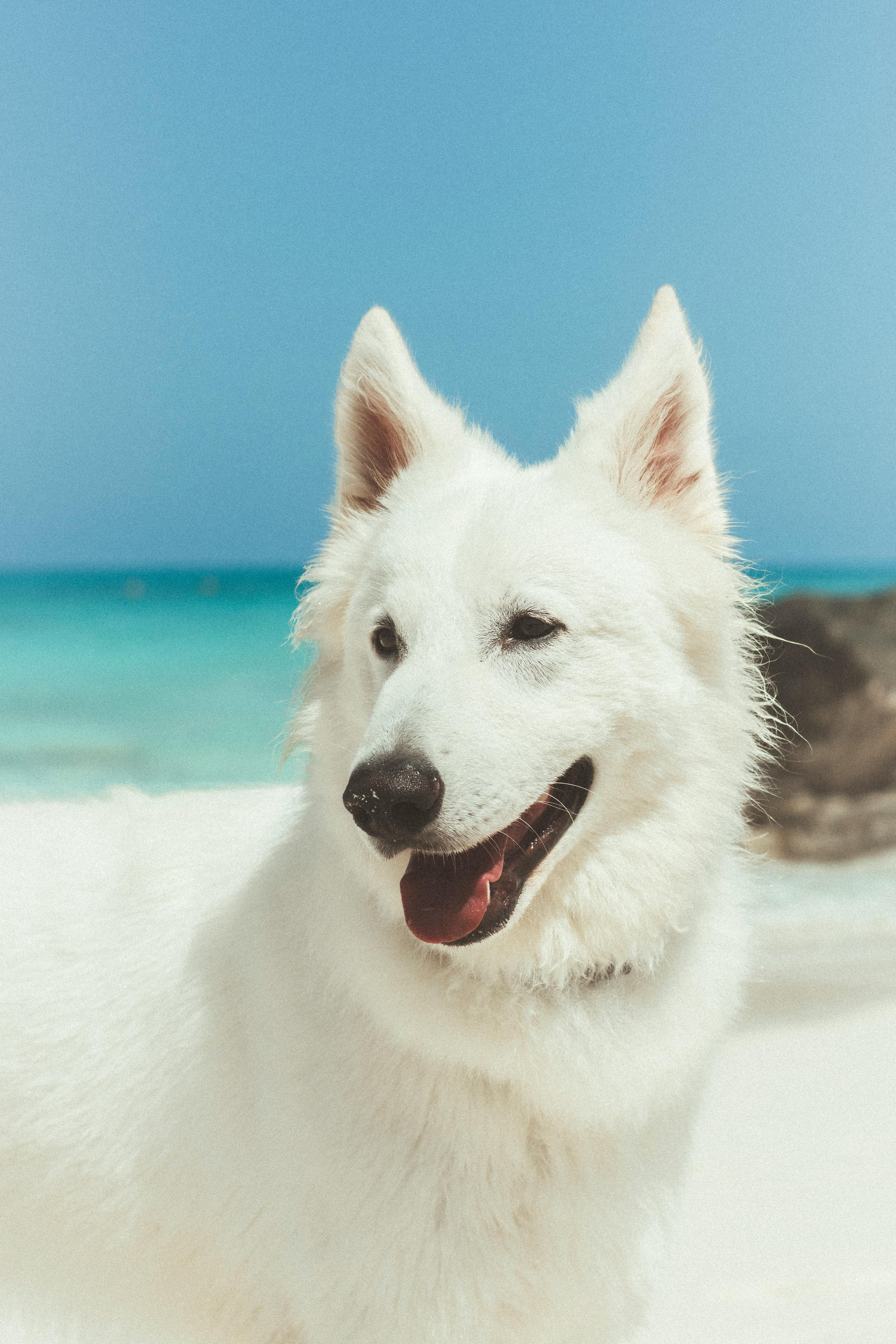A beautiful White Swiss Shepherd dog enjoying a sunny day at the beach with turquoise waters.