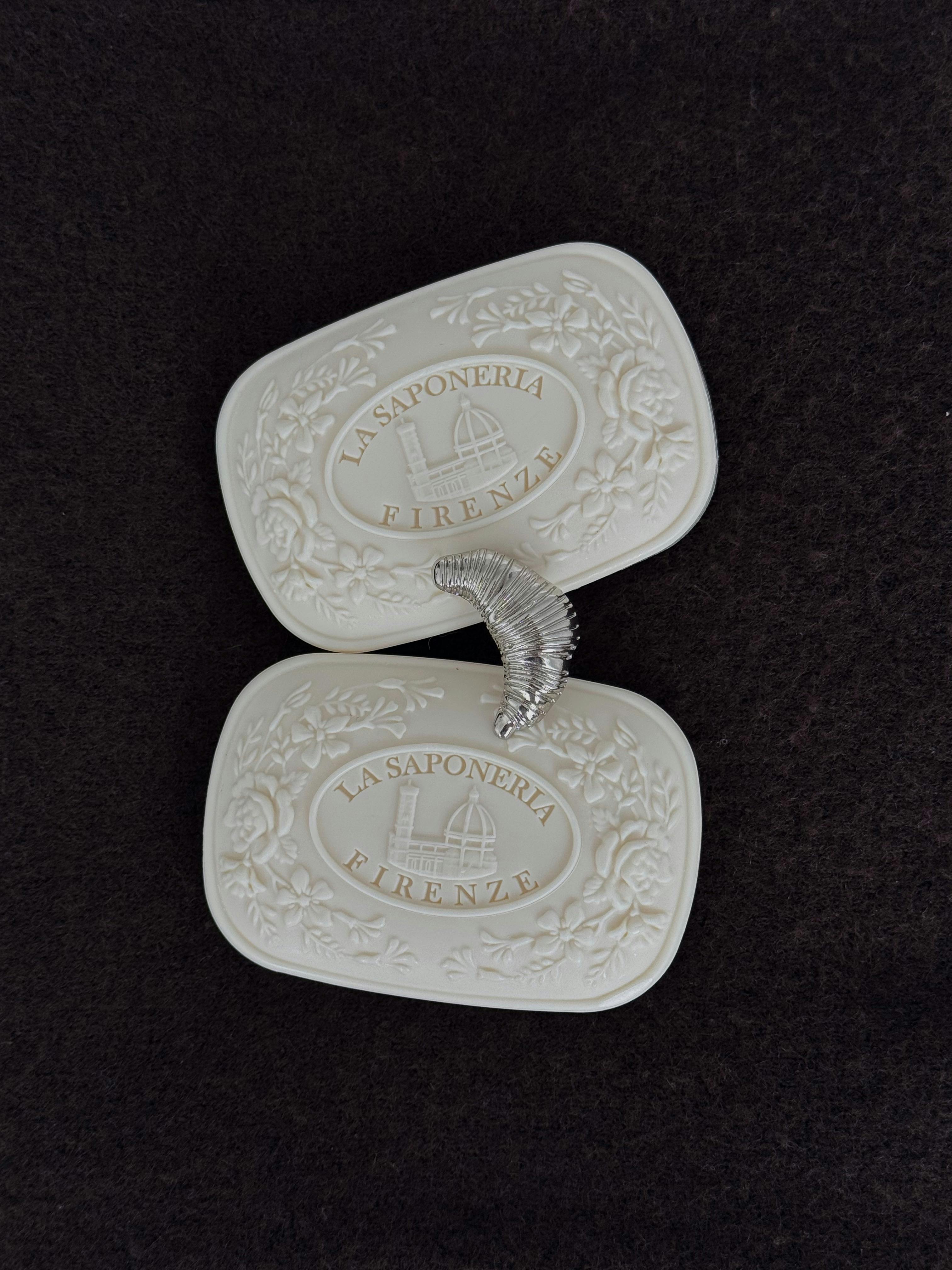 Close-up of artisan embossed soap from Florence displayed on dark background.