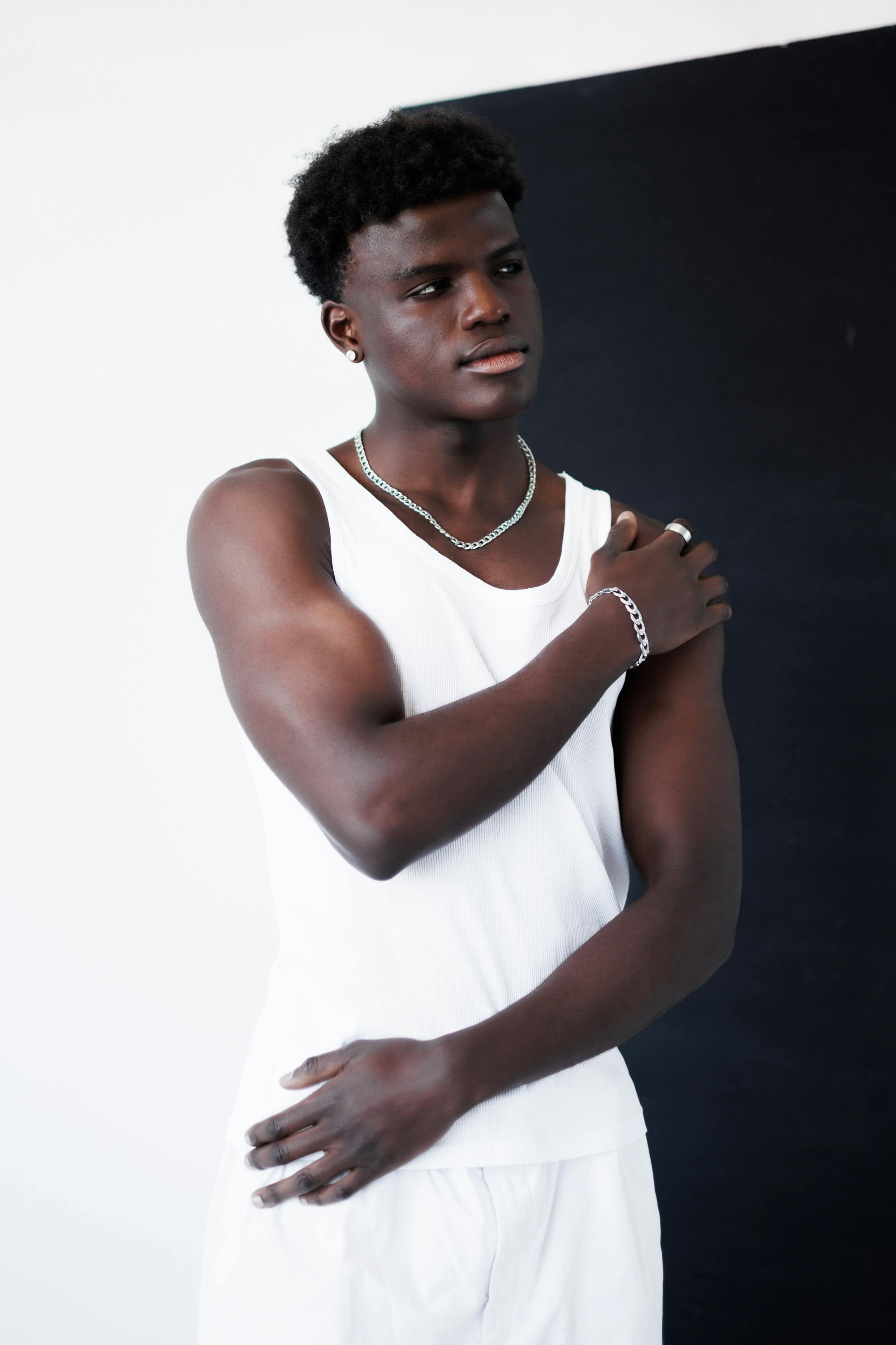 Artistic black and white portrait of a man with Polaroid photos and sunglasses showcasing a modern fashion style.