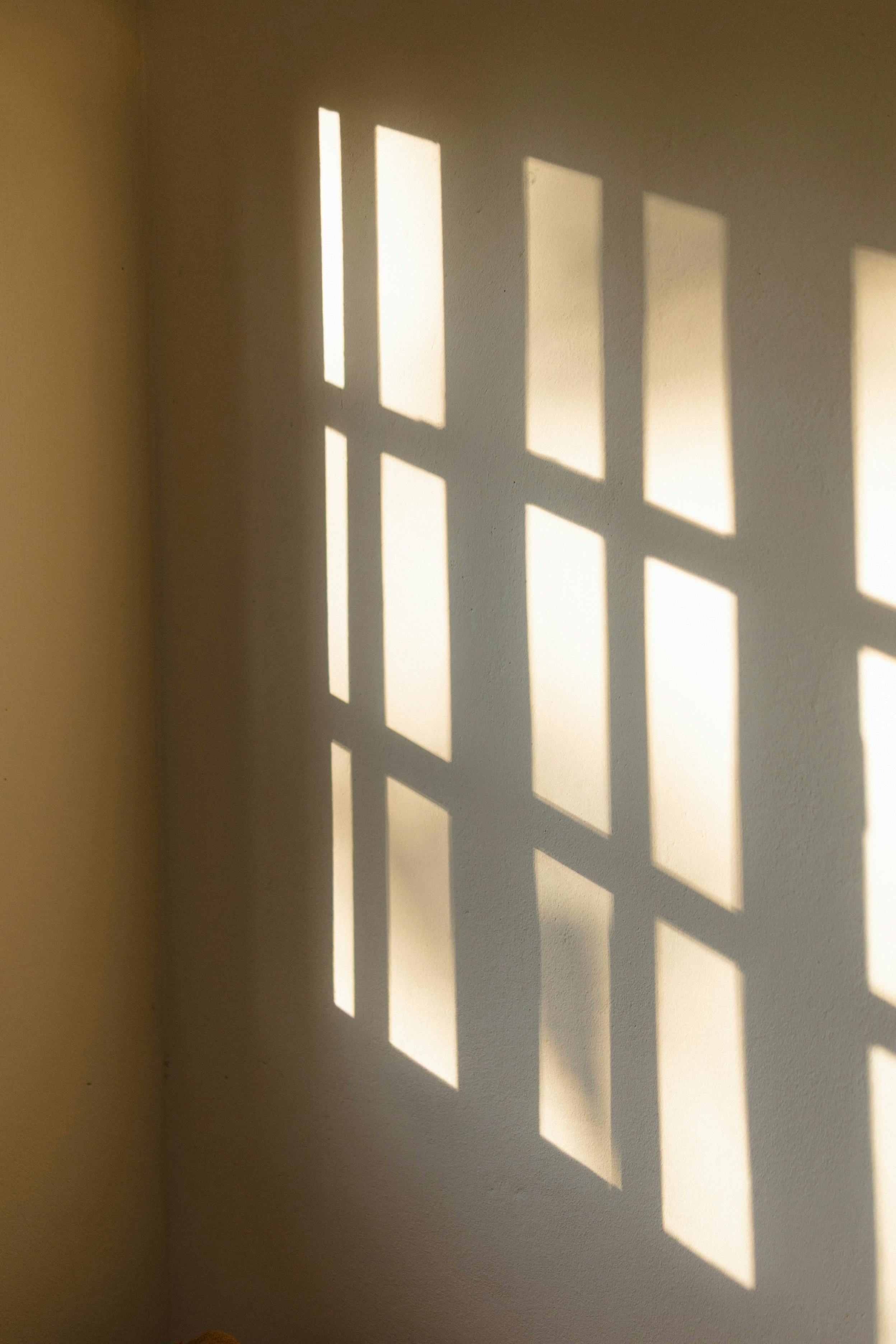 Minimalist image of window shadows projected on a wall, creating a geometric pattern.