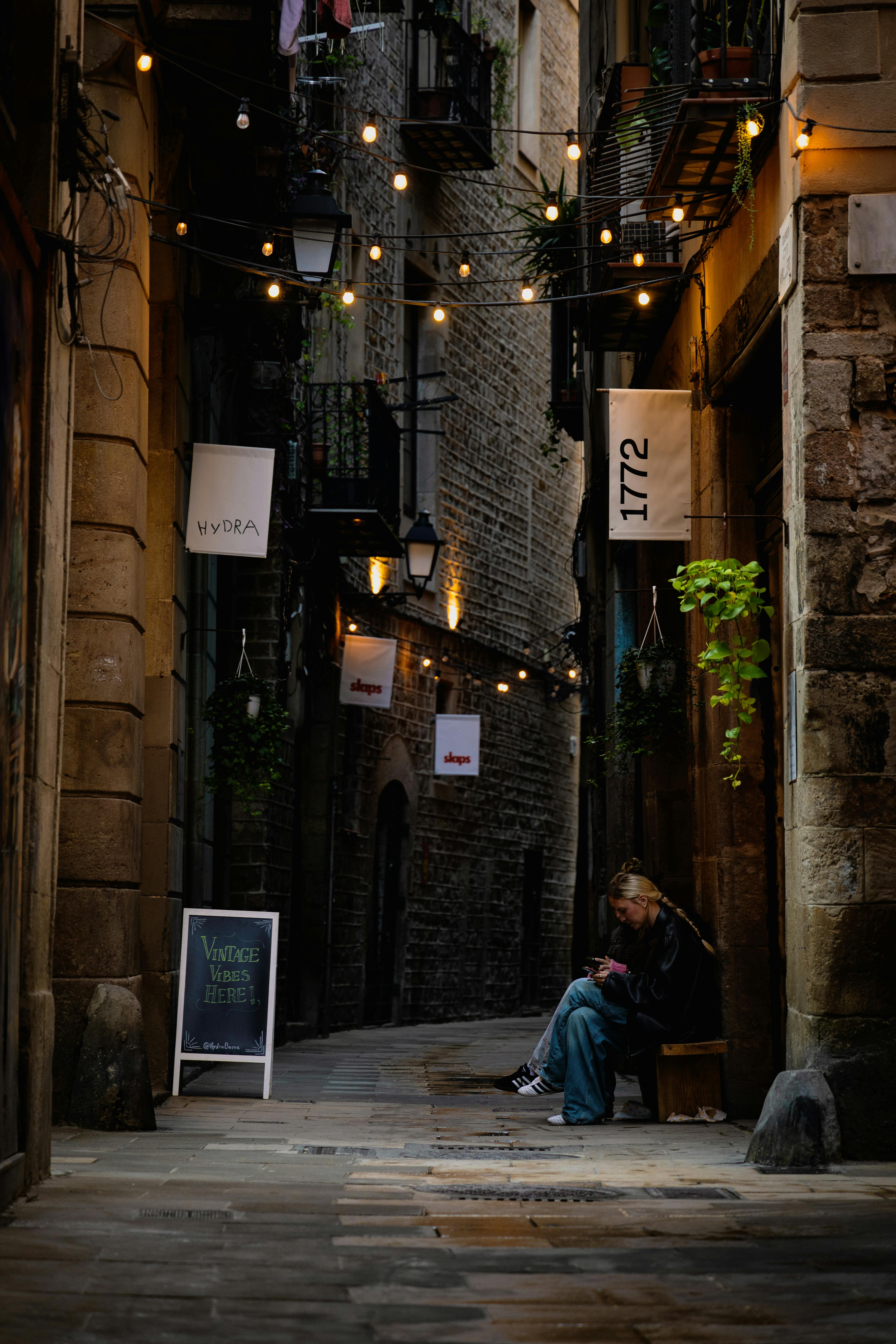 Discover the moody allure of a historic Barcelona alley illuminated by string lights.