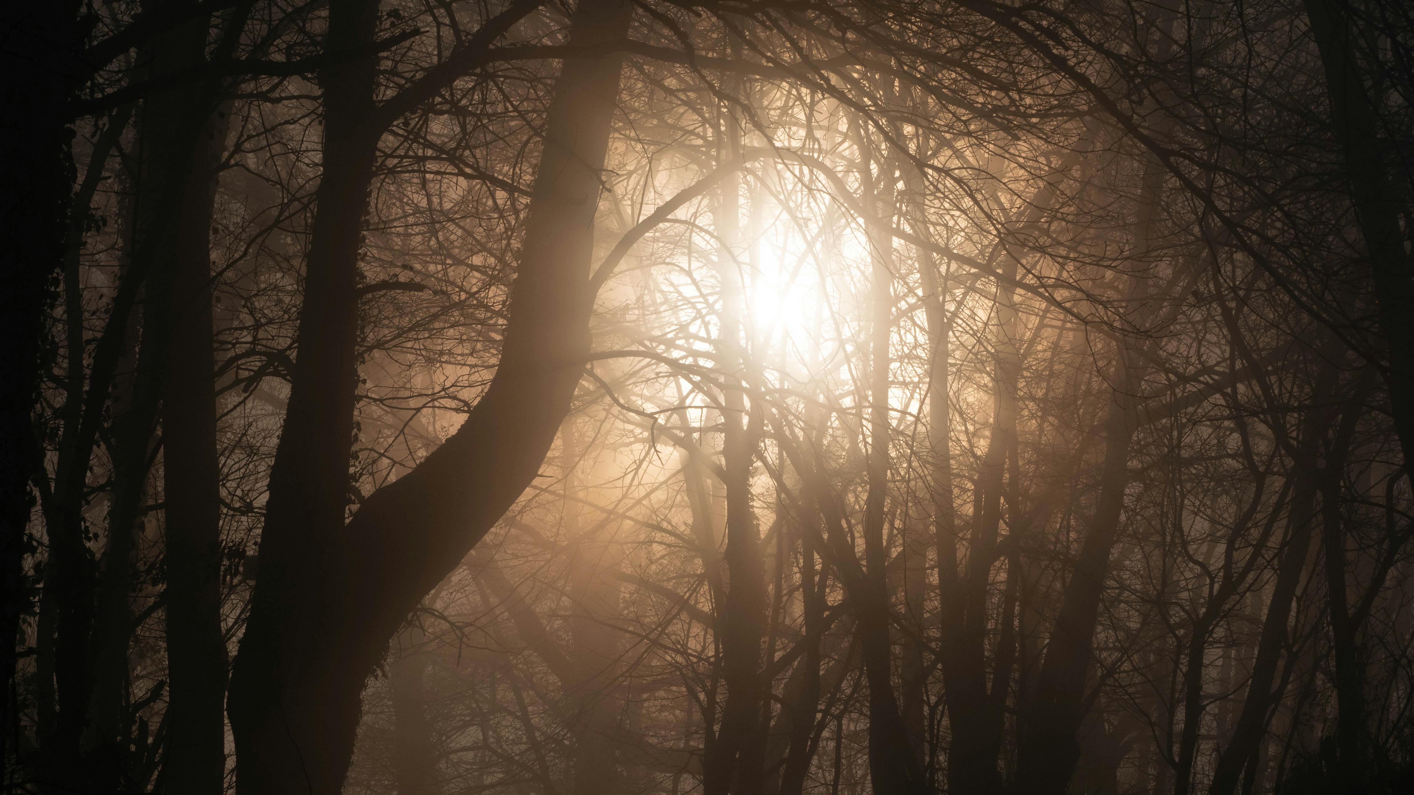 Sunlight breaks through foggy trees in Occitanie's serene forest.