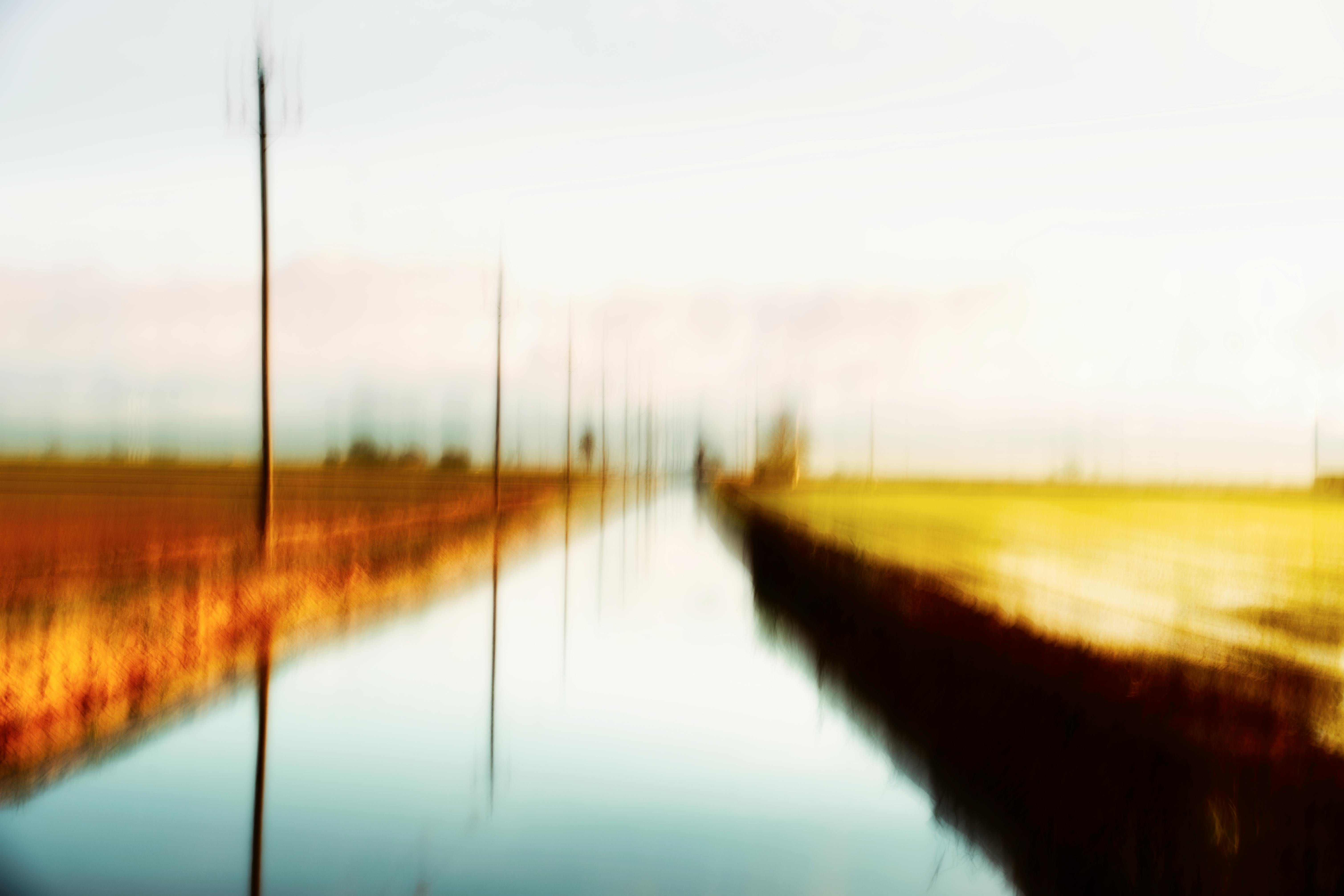 Blurred canal view with vibrant colors creating a serene, abstract landscape.