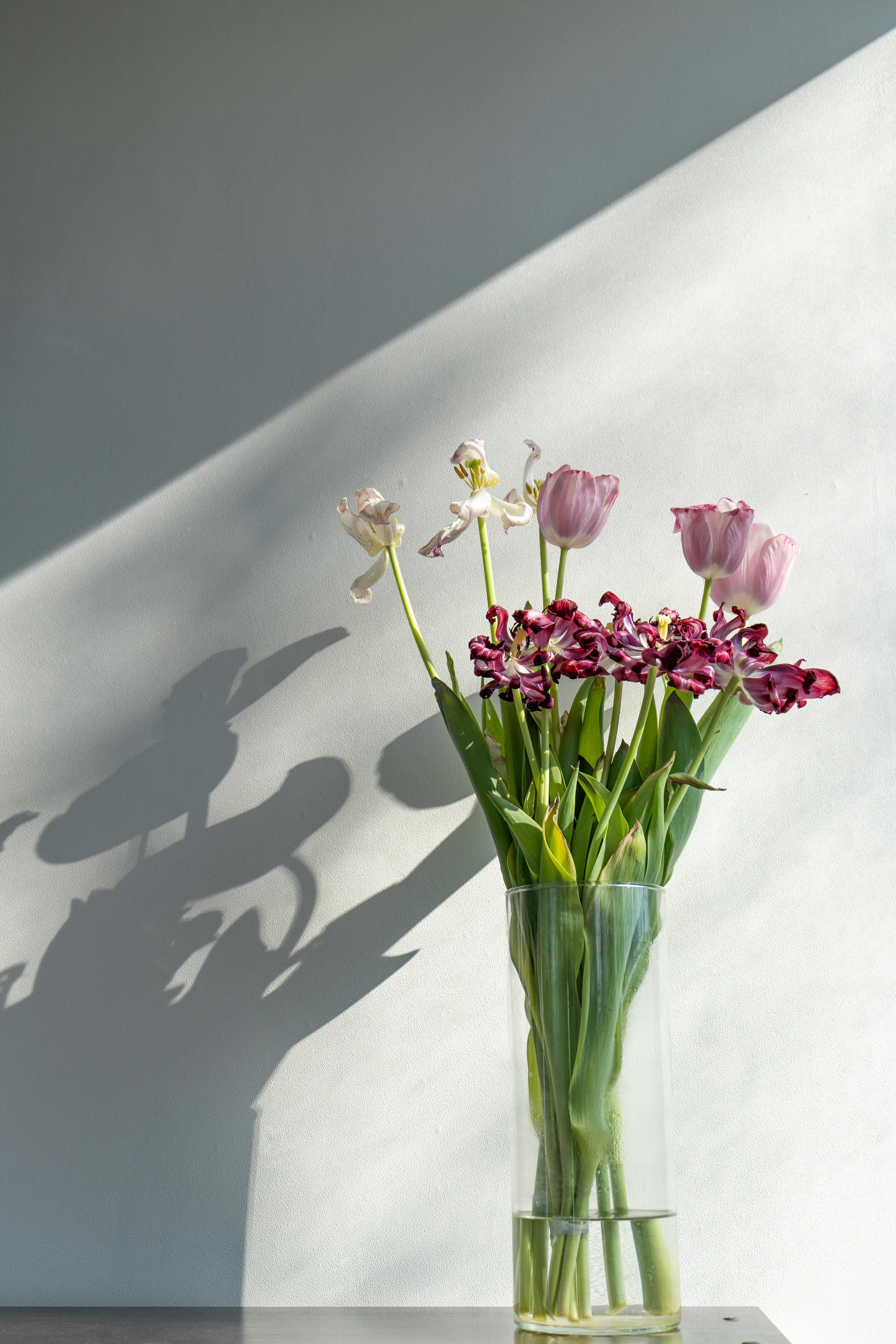 A clear glass vase with pink tulips in soft sunlight casting shadows on the wall.