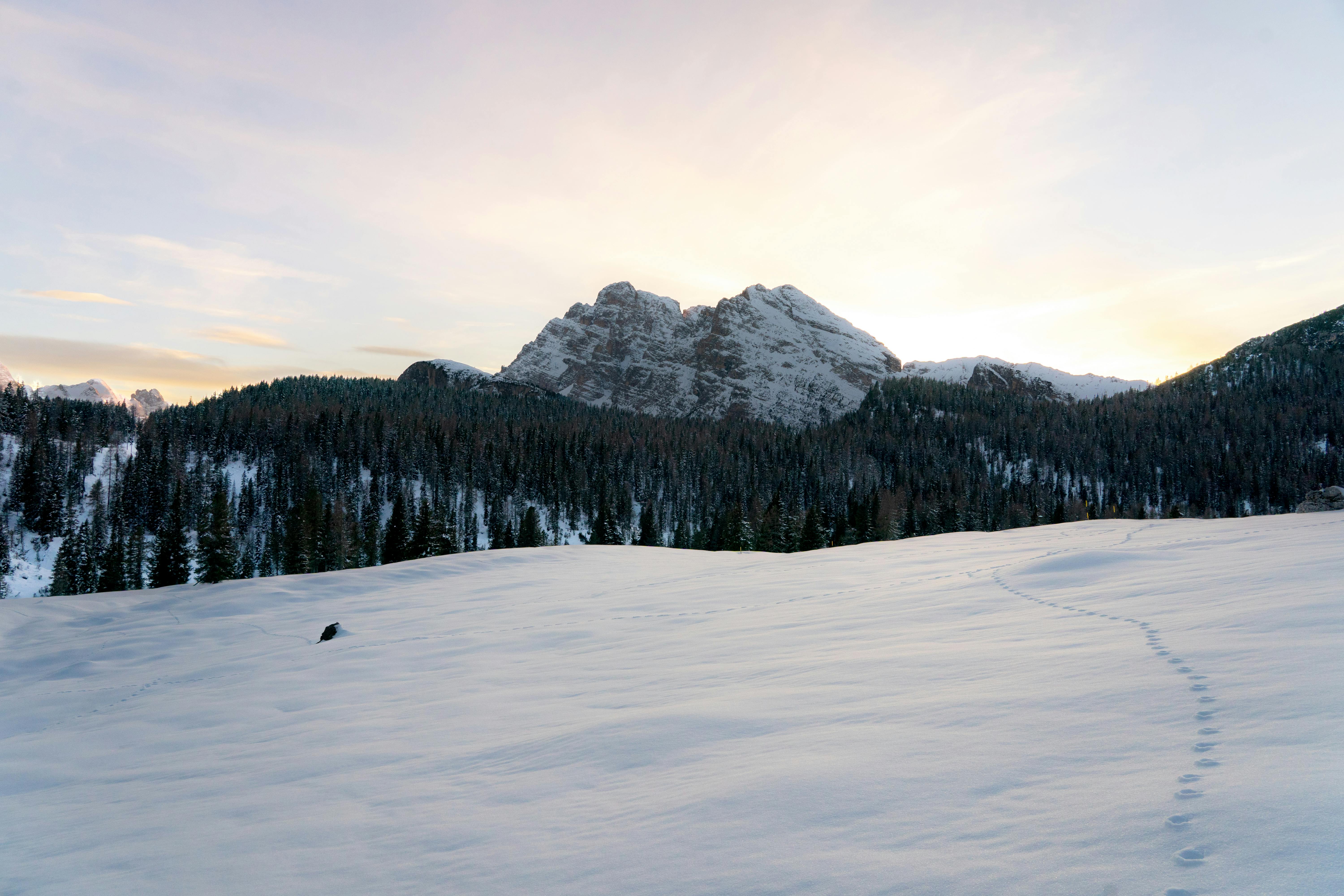A serene winter view of snow-covered mountains at sunset with a backdrop of striking trees in the Dolomites.