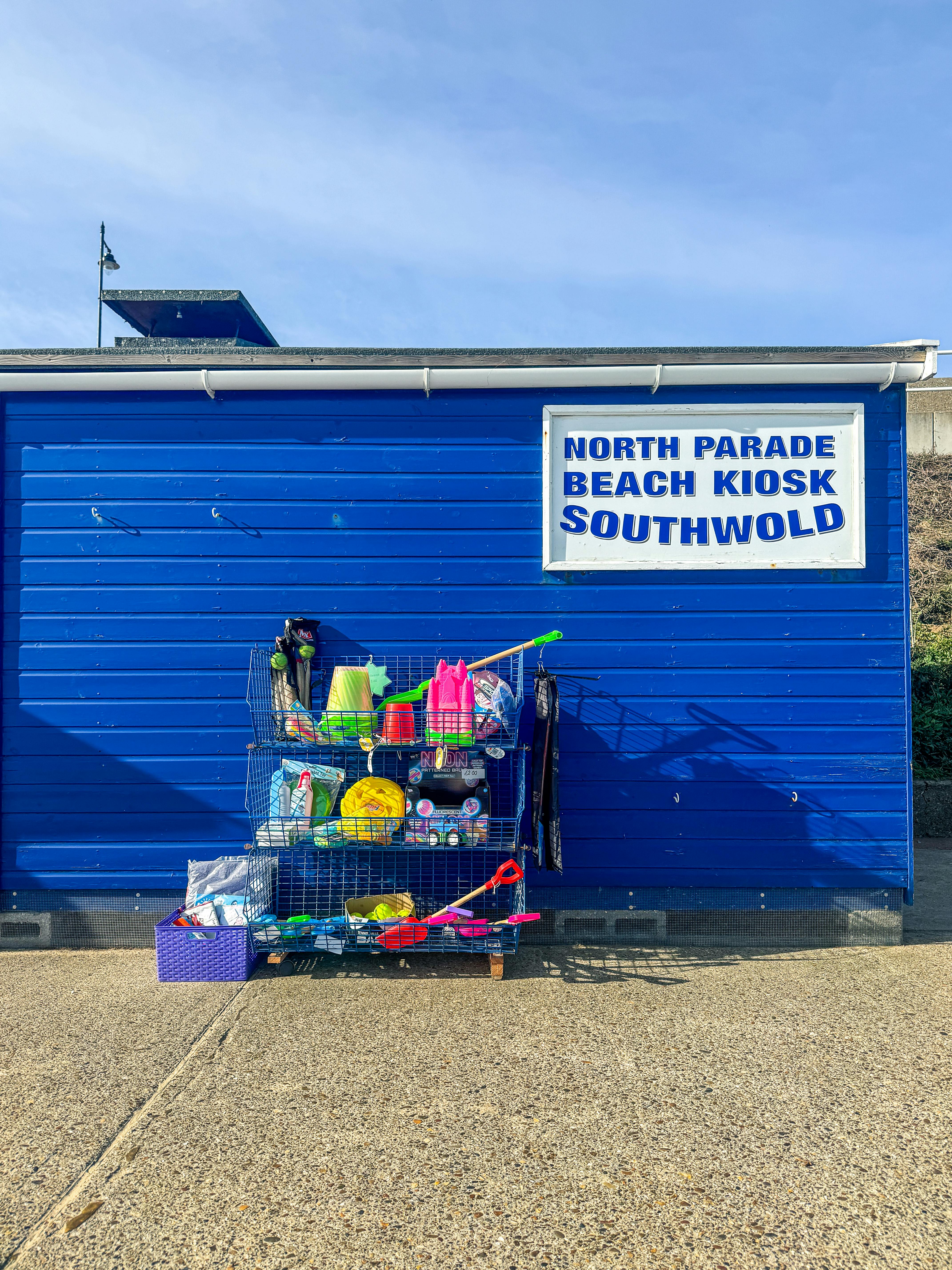 Vibrant beach kiosk with toys and gear in Southwold, England.