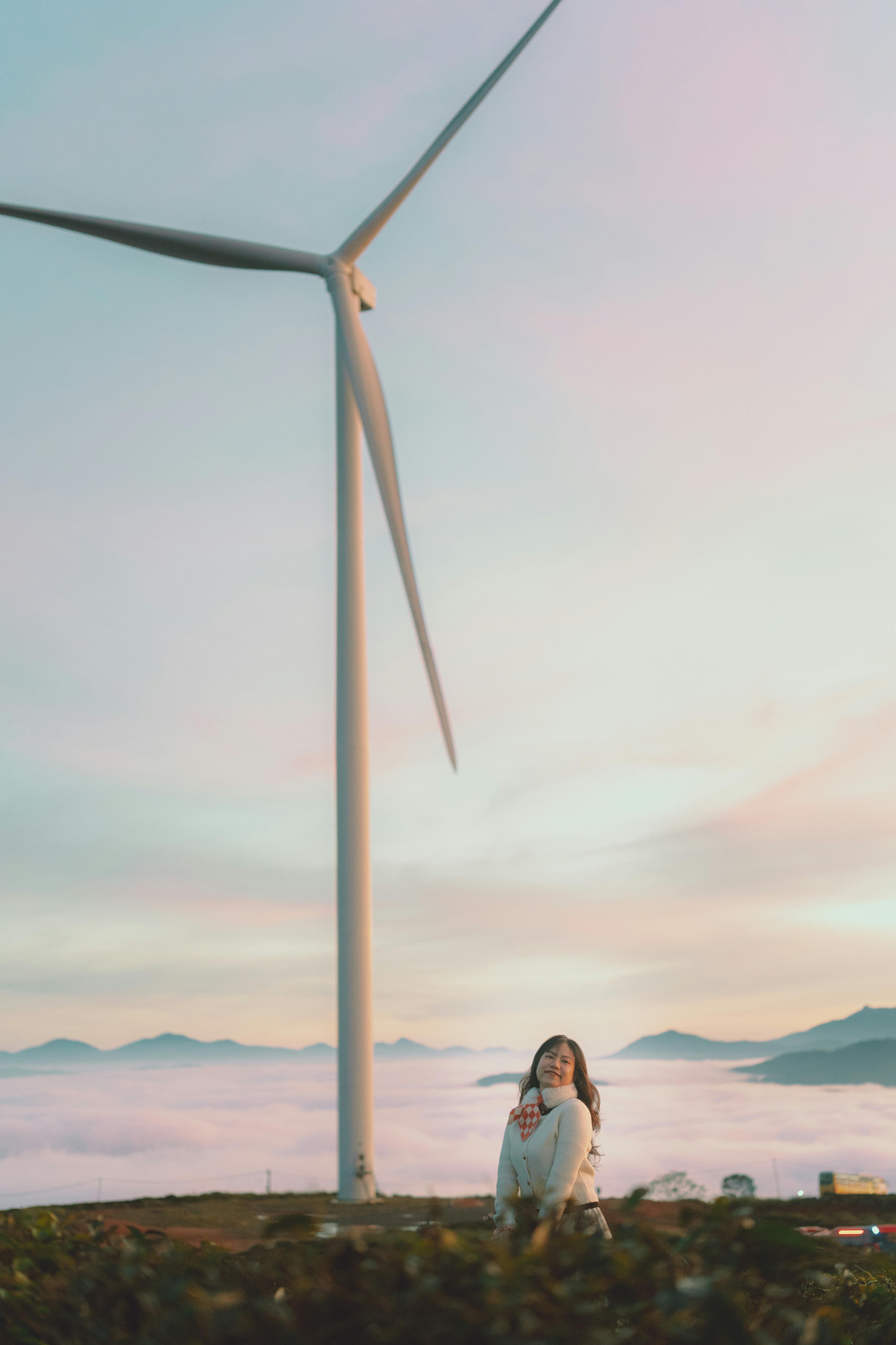 A woman sitting near a wind turbine with a serene sunrise backdrop in Dalat, Vietnam.
