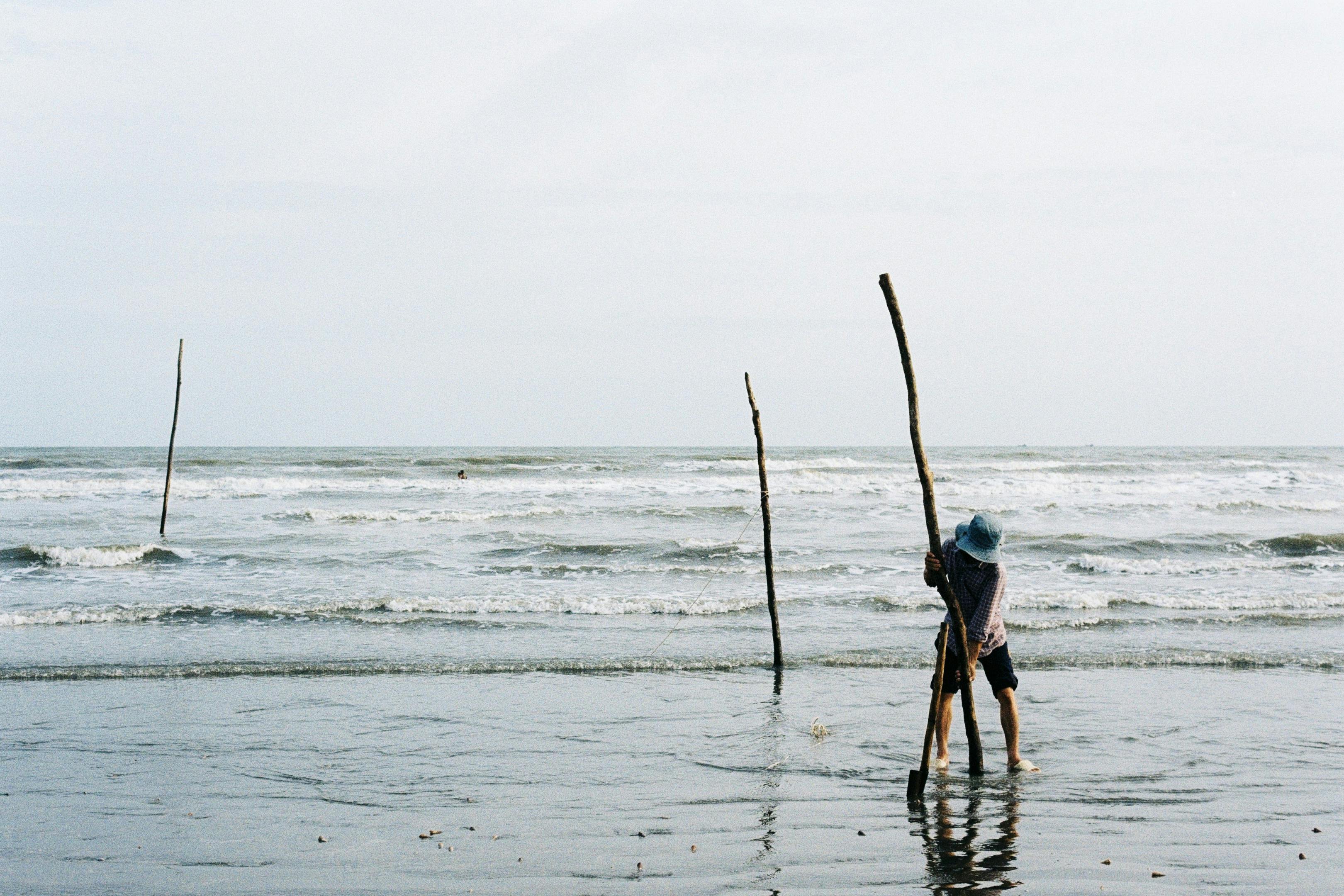 A person with sticks walking along a serene beach in Ho Chi Minh City, Vietnam.