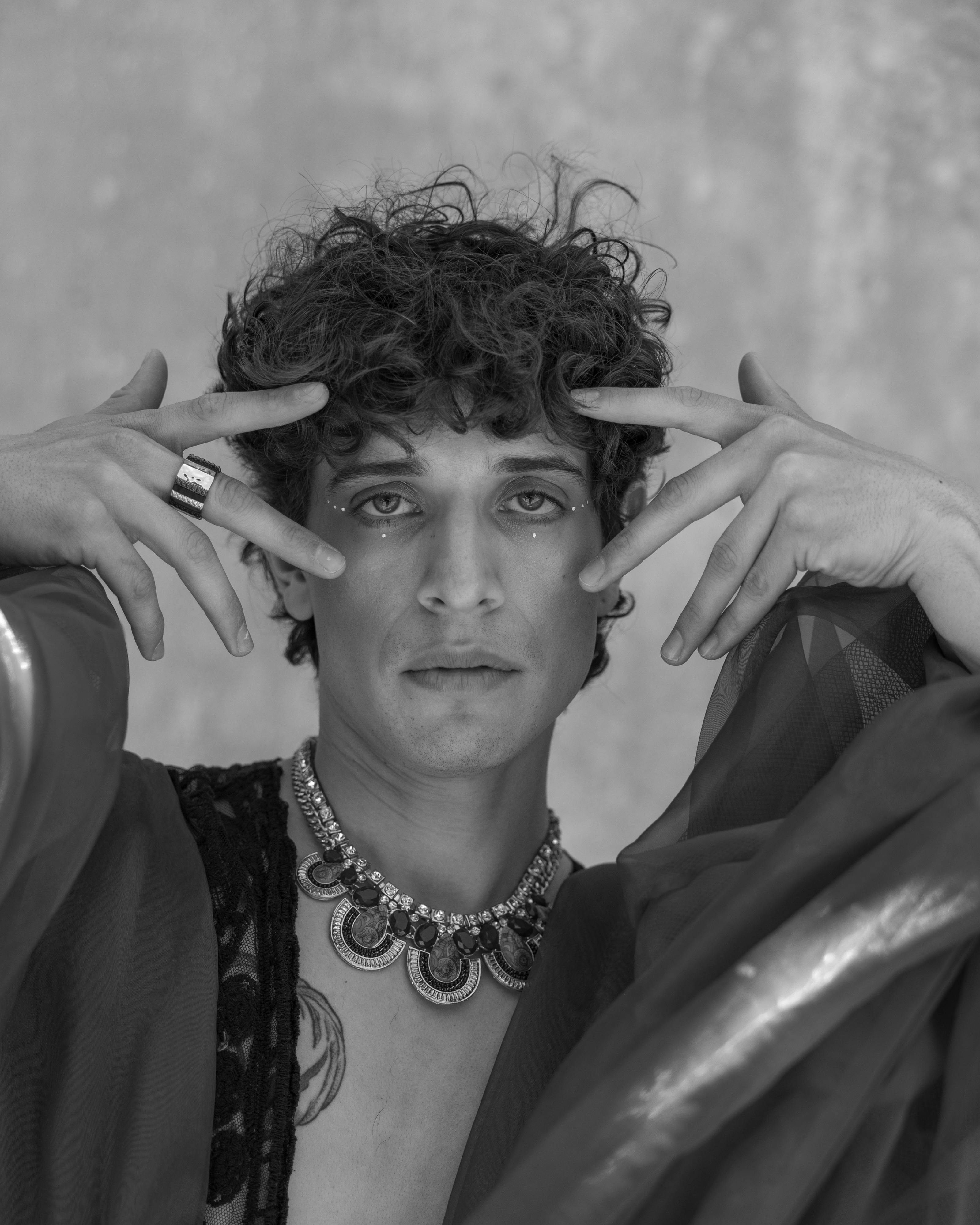A dramatic black and white portrait with expressive gestures and jewelry.