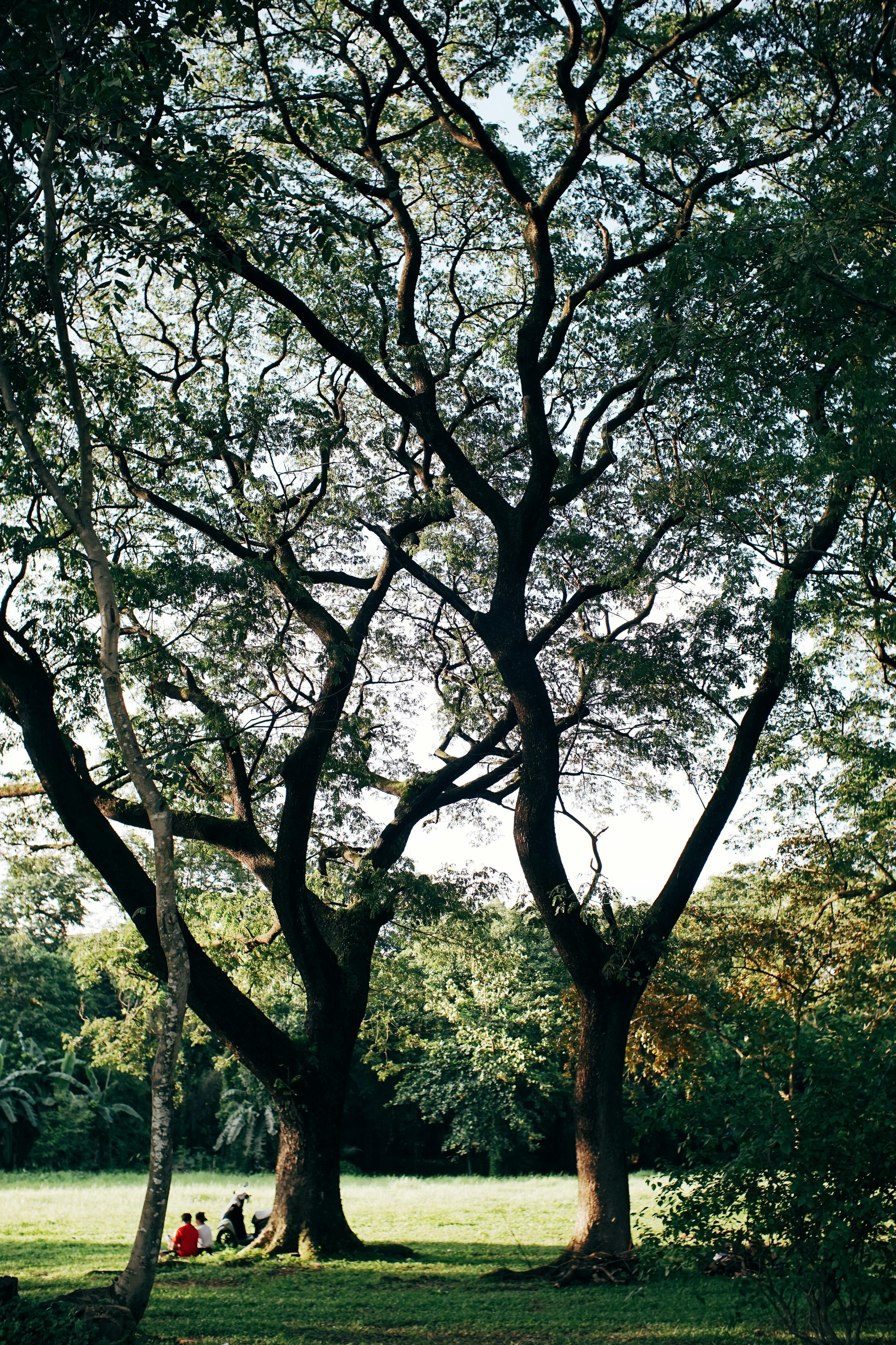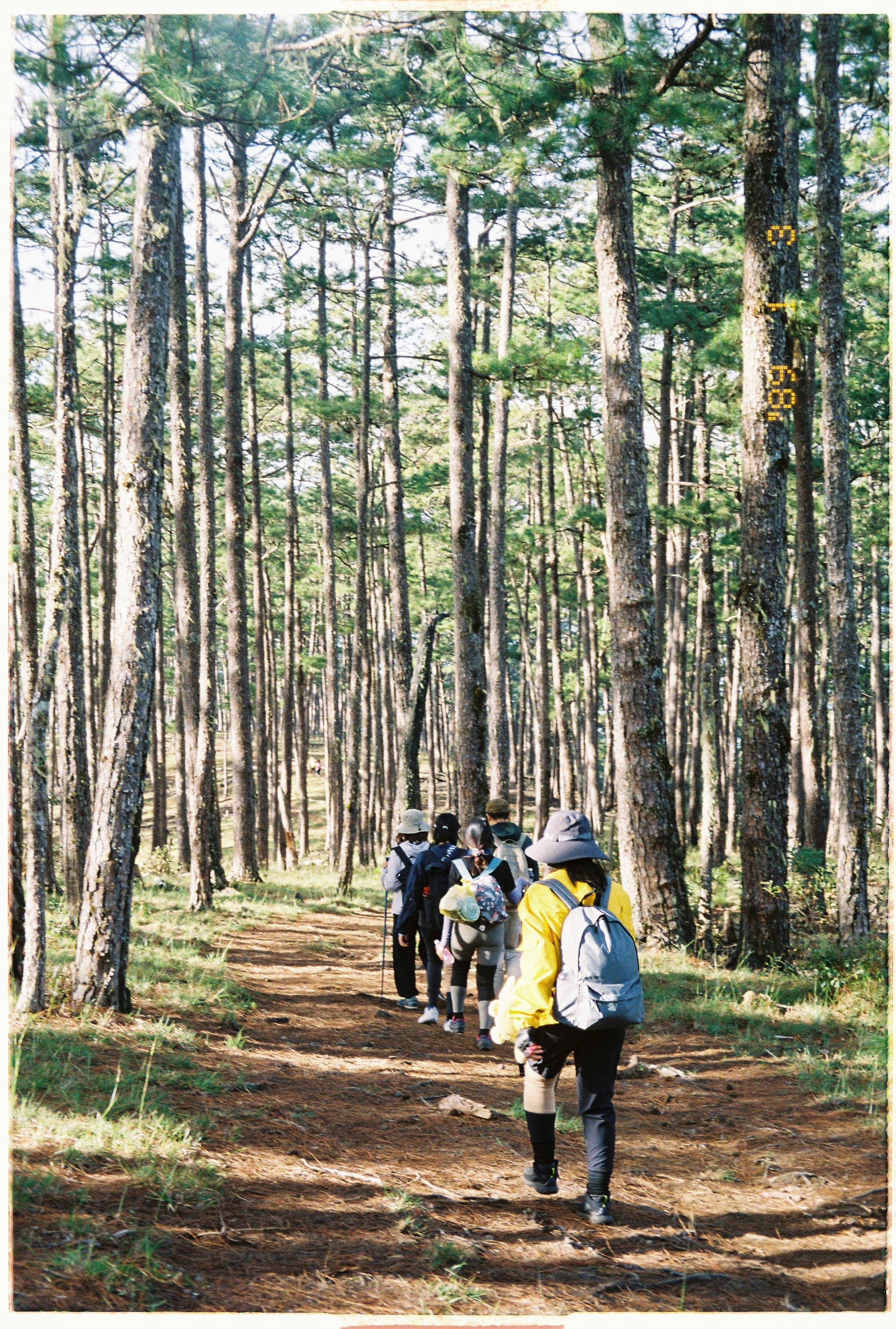 A group of hikers exploring a serene forest trail on a sunny day, surrounded by tall trees.