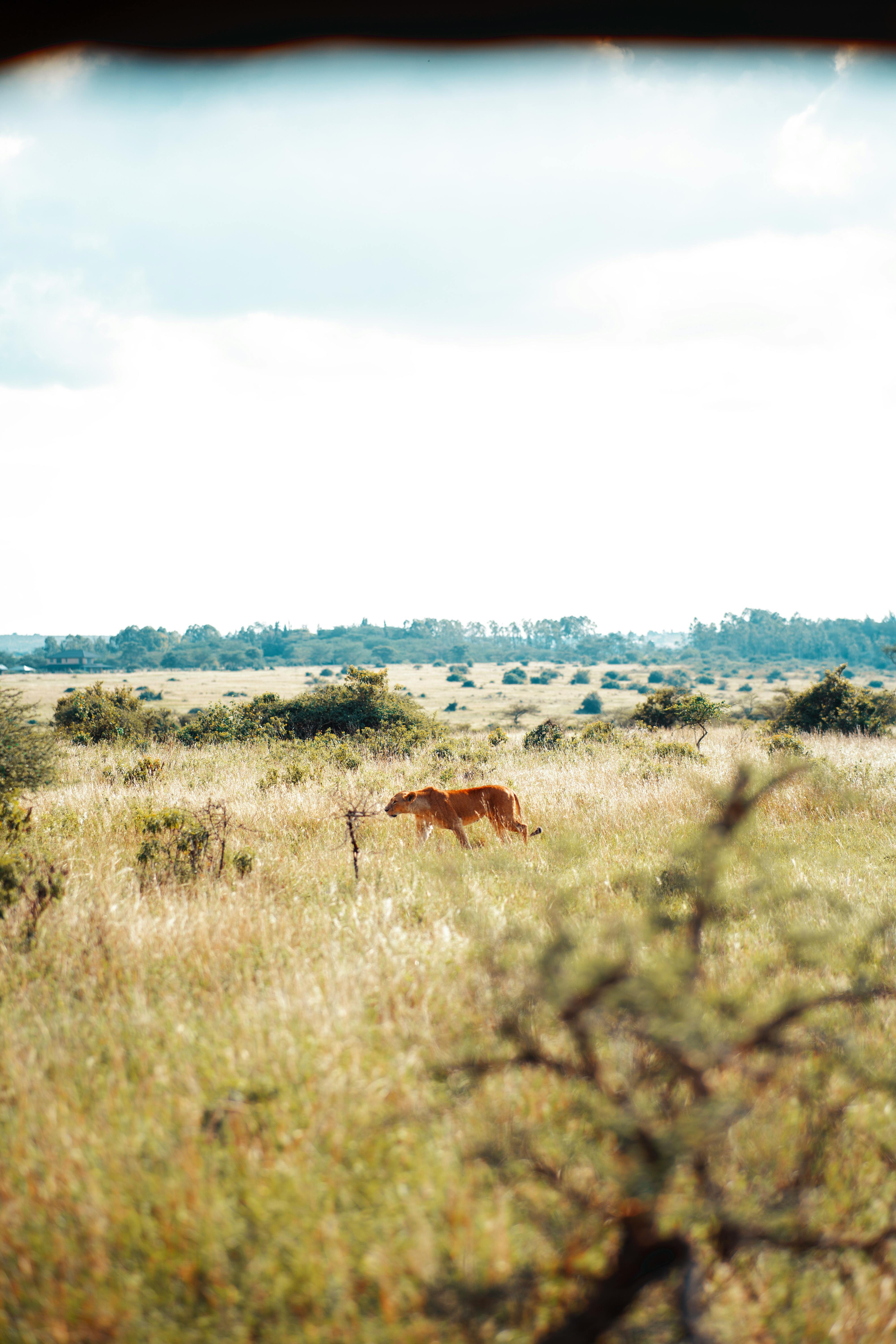 A solitary lion traverses the vast grasslands of Nairobi, Kenya under a bright clear sky.