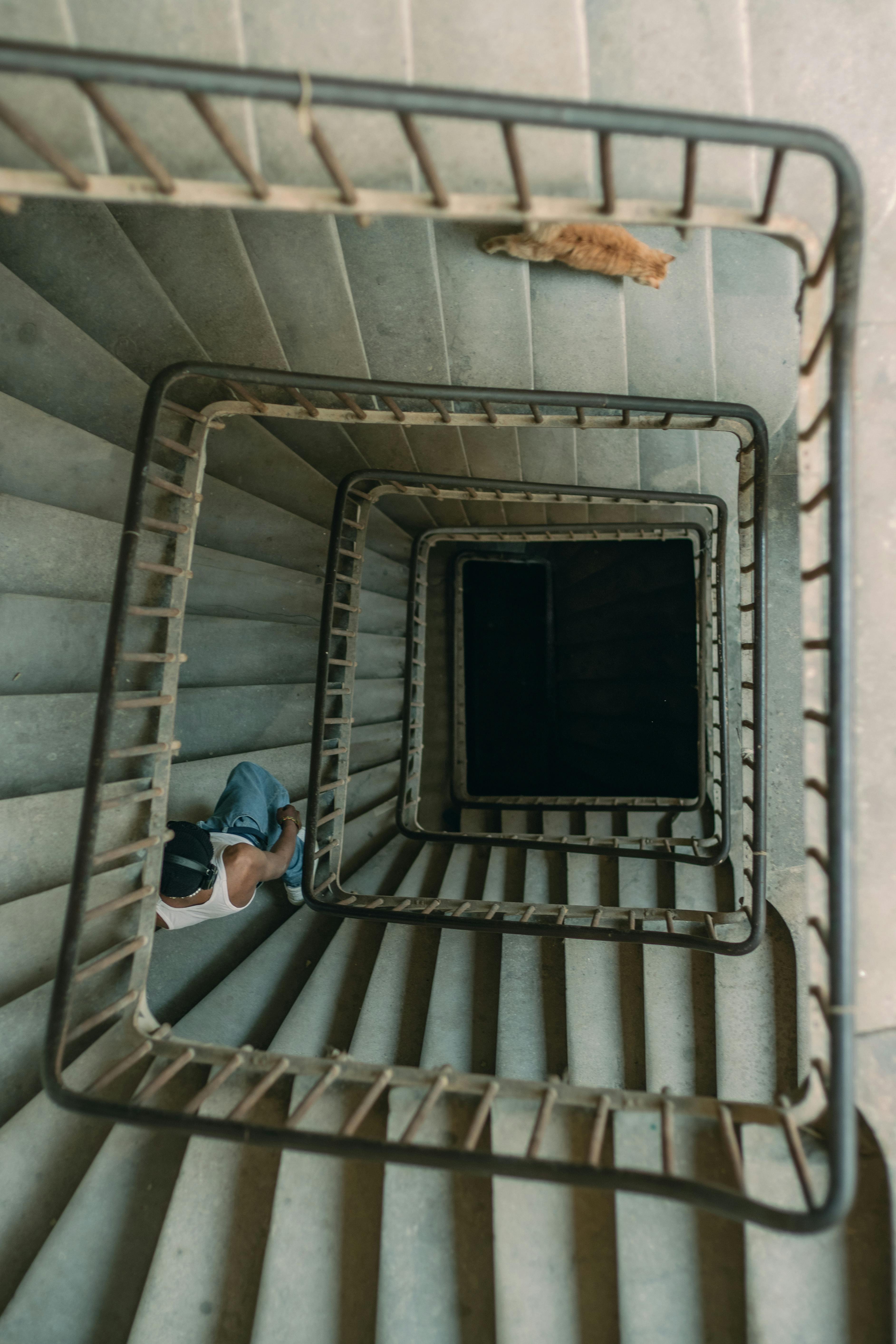 Top-down view of spiral staircase with a person descending, conveying urban exploration.