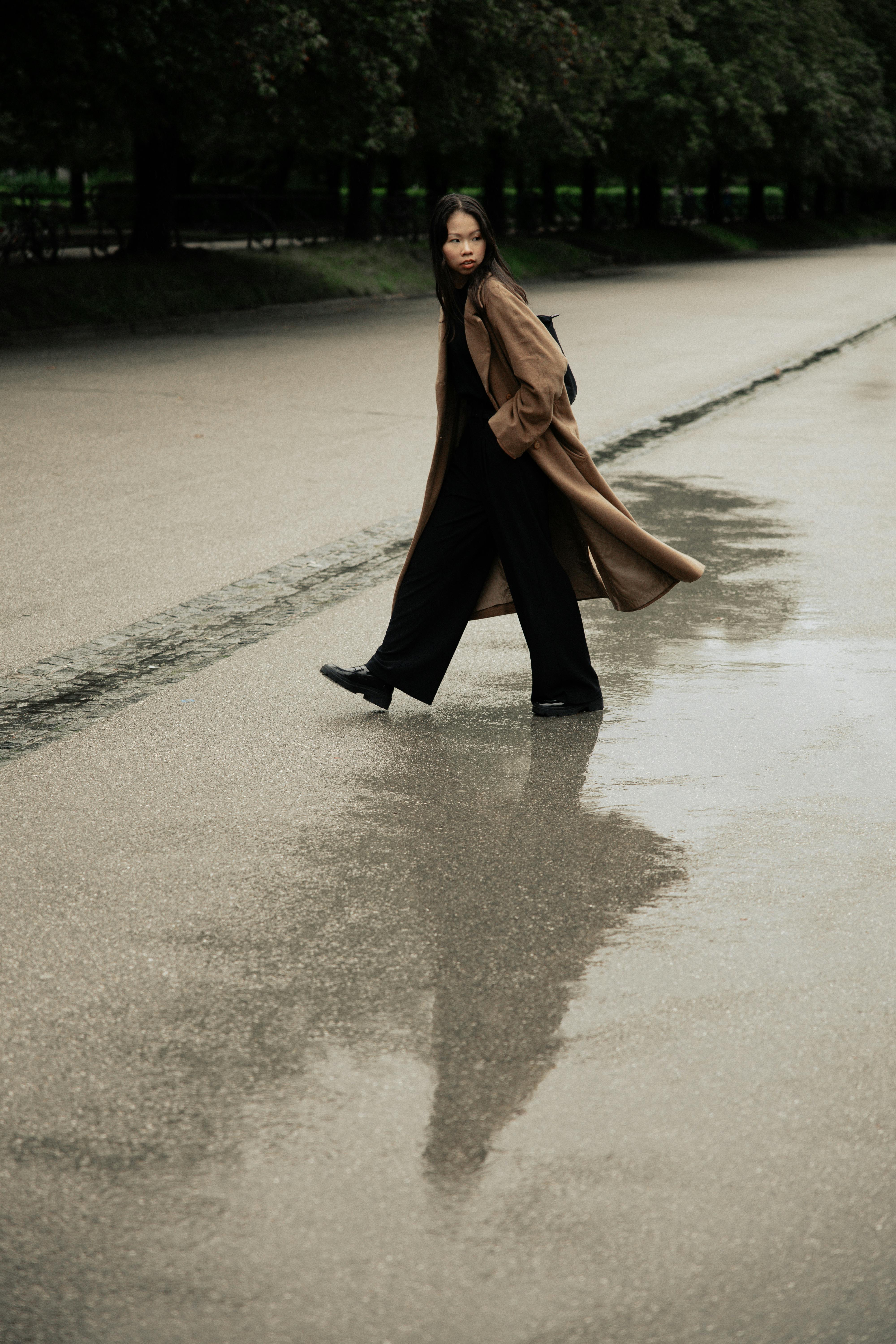 Stylish woman walking on a rainy street in Munich, reflecting in a puddle.