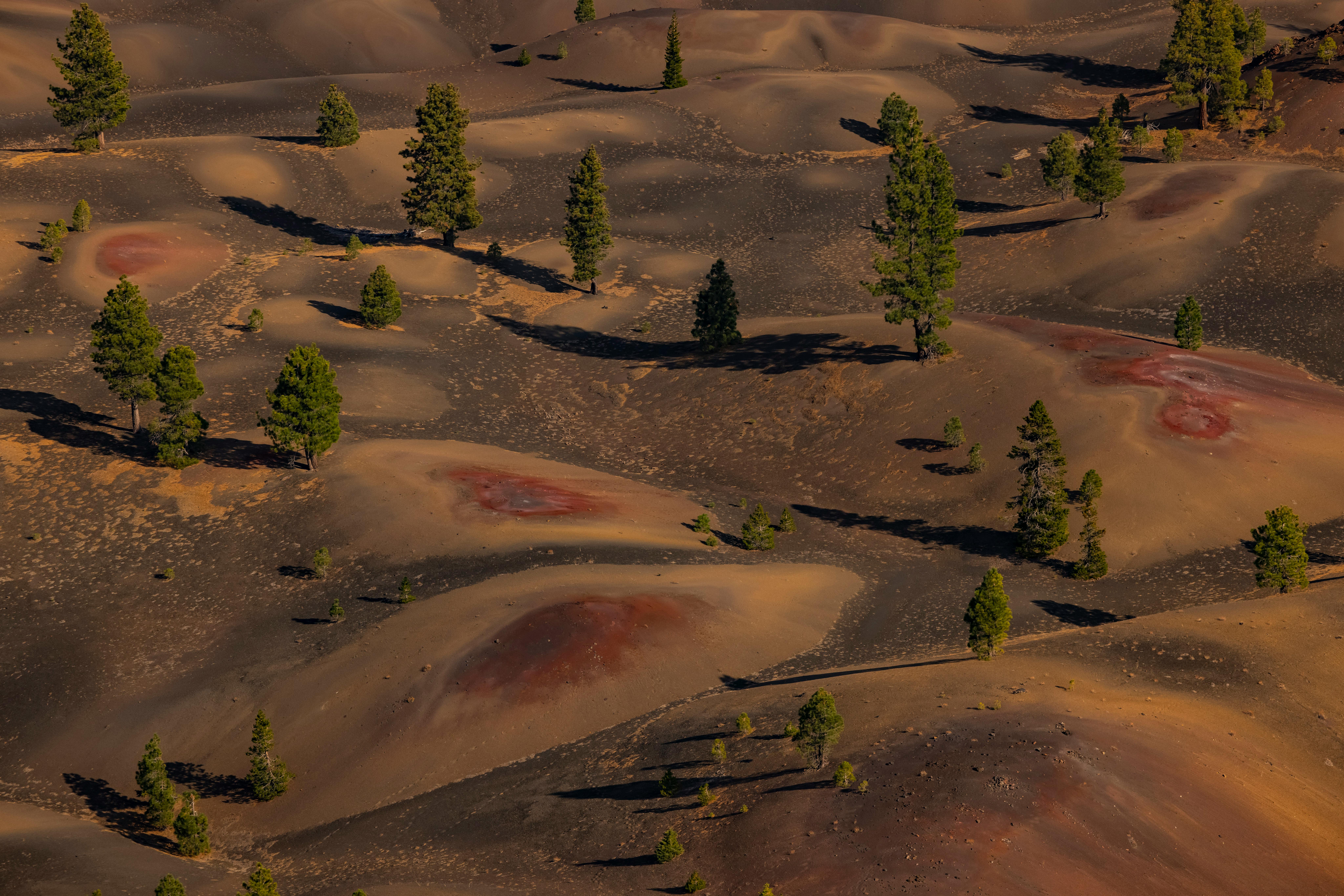 Stunning aerial shot of the Painted Dunes landscape with scattered green trees.