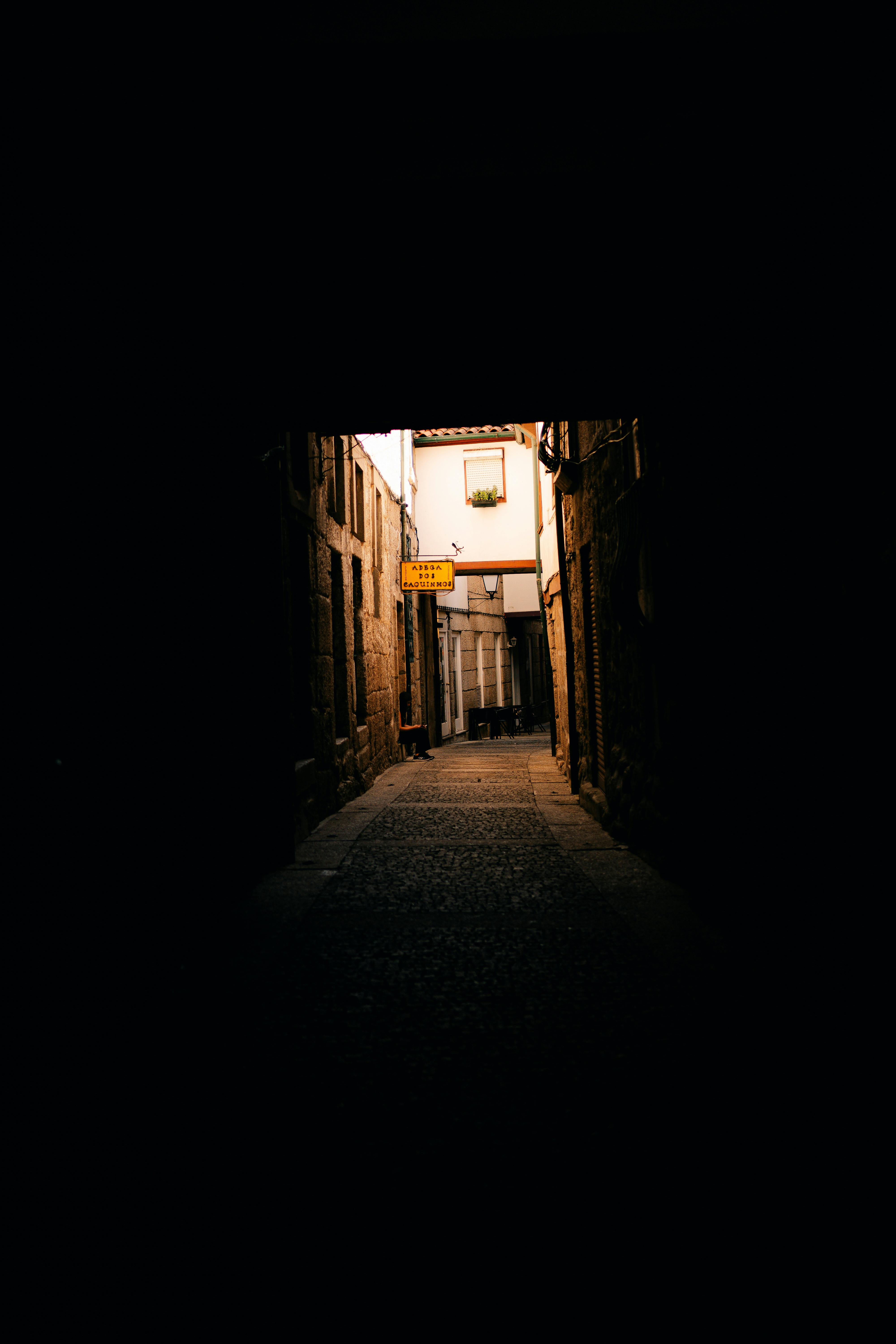 Dark alley with warm illumination emerging into daylight, creating a contrast.