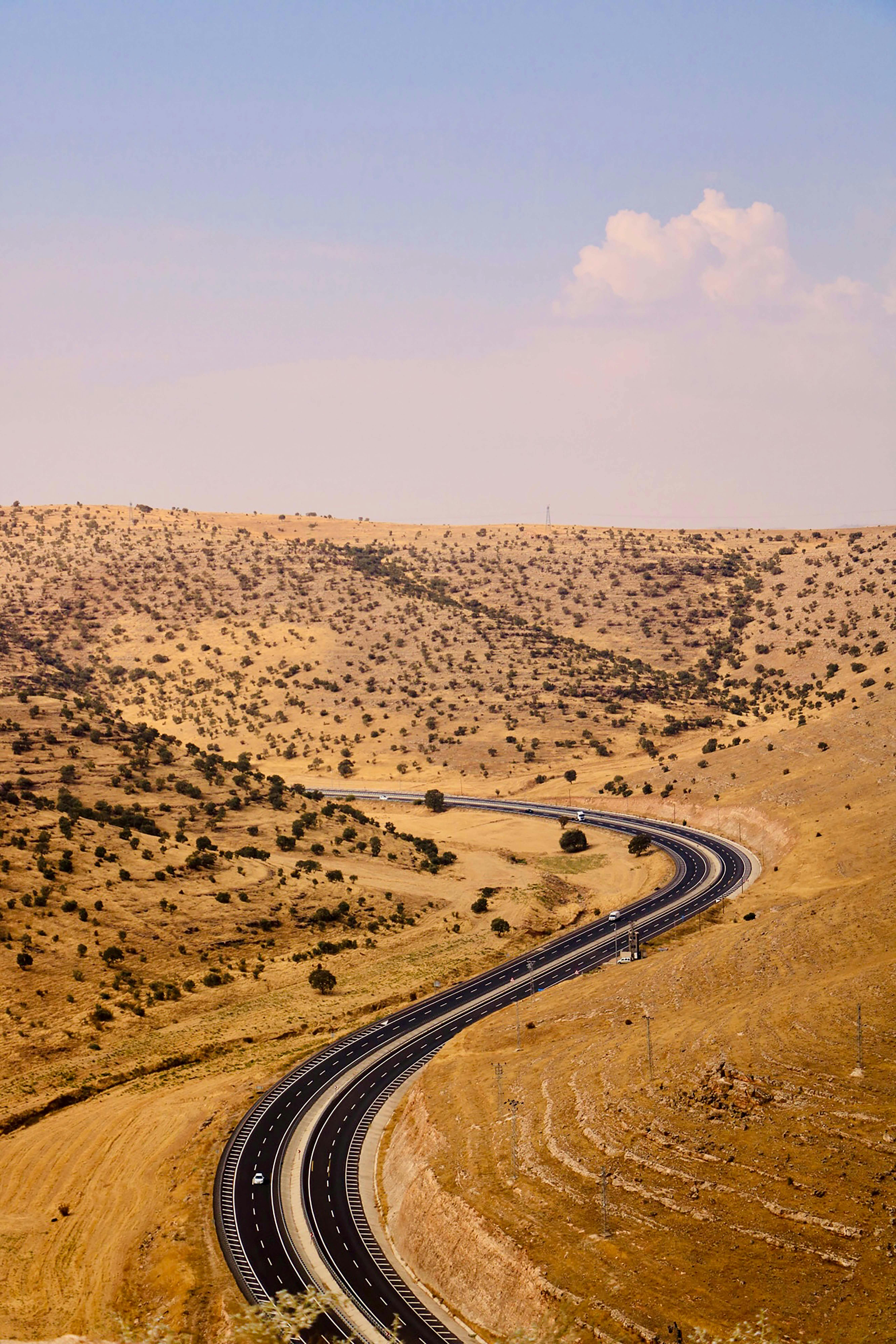 A picturesque winding road through the arid hills of Mardin, Türkiye under a blue sky.