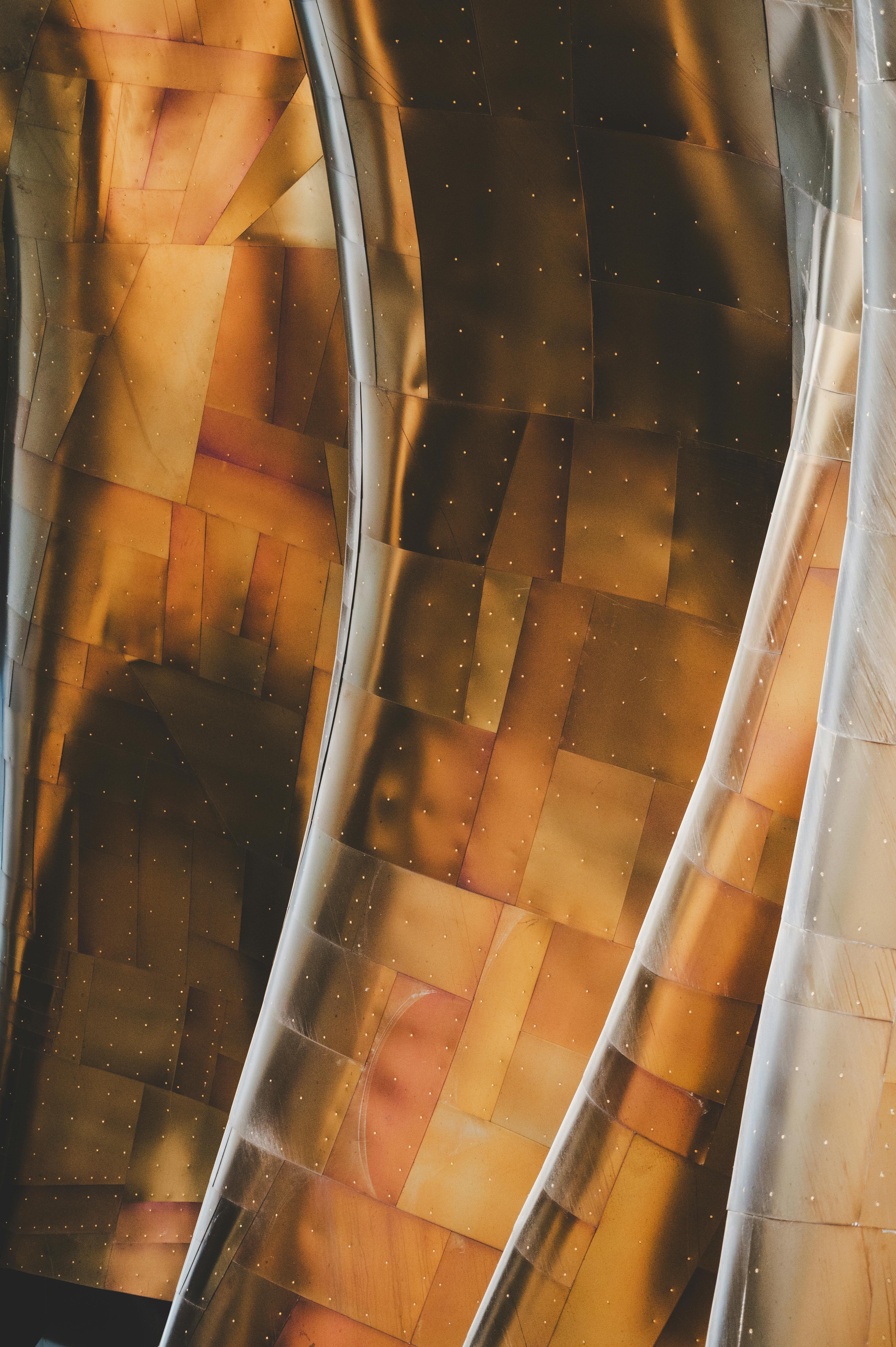 Close-up view of the iconic metal surface of Seattle's Museum of Pop Culture, highlighting the unique texture and colors.