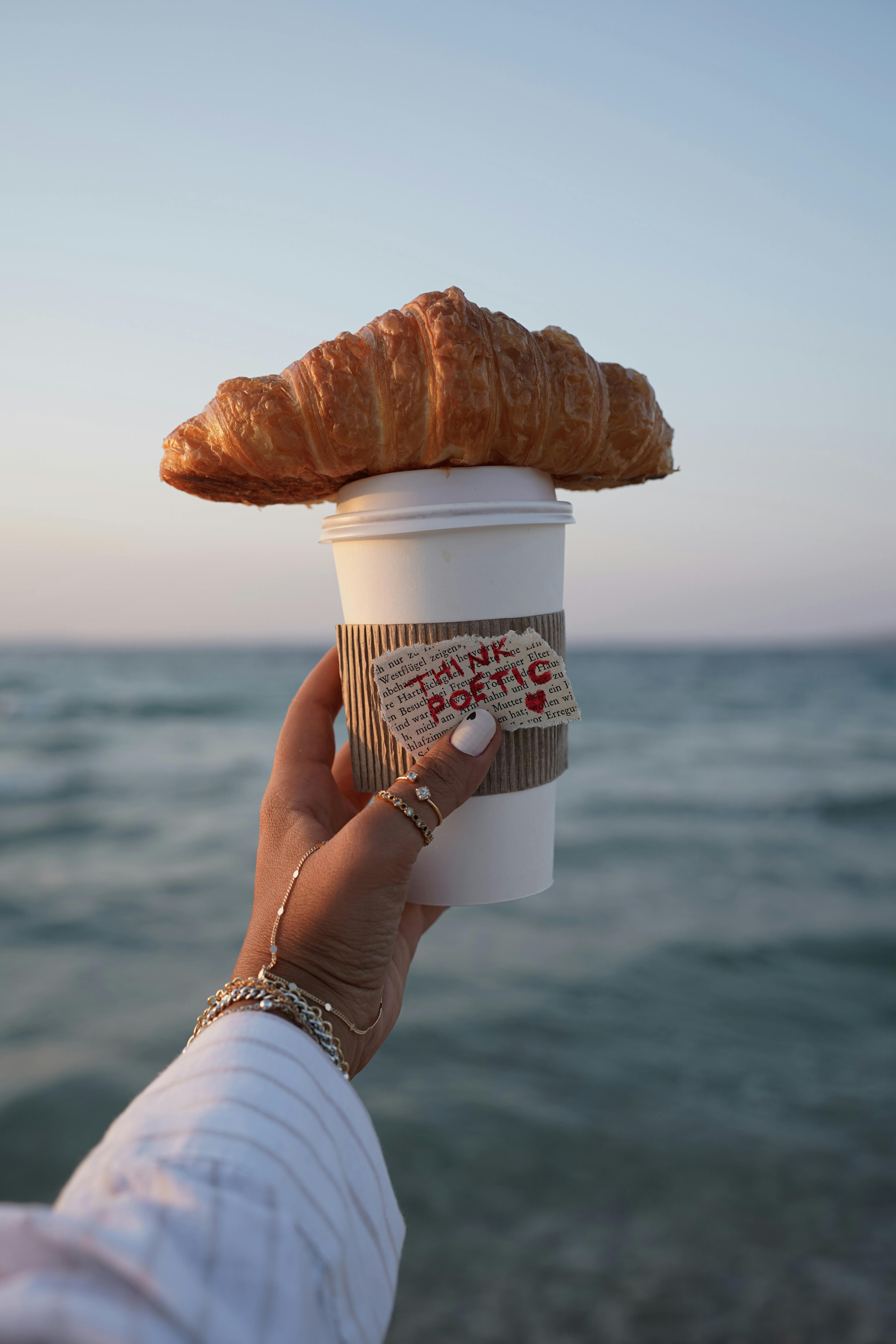 Hand holding a coffee cup topped with a croissant by the beach at sunrise.