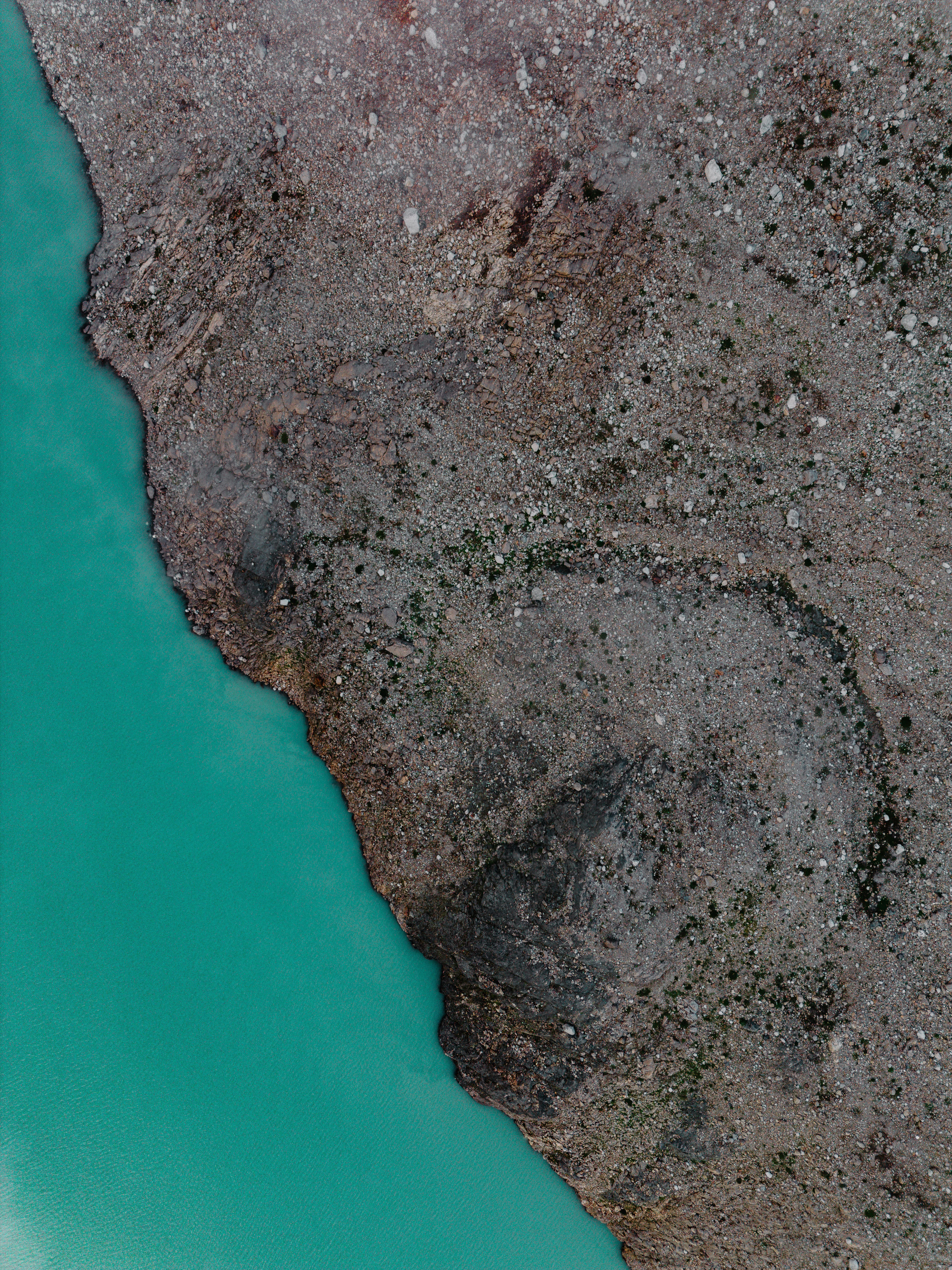 Dramatic aerial shot showcasing rocky shoreline and vibrant turquoise water.
