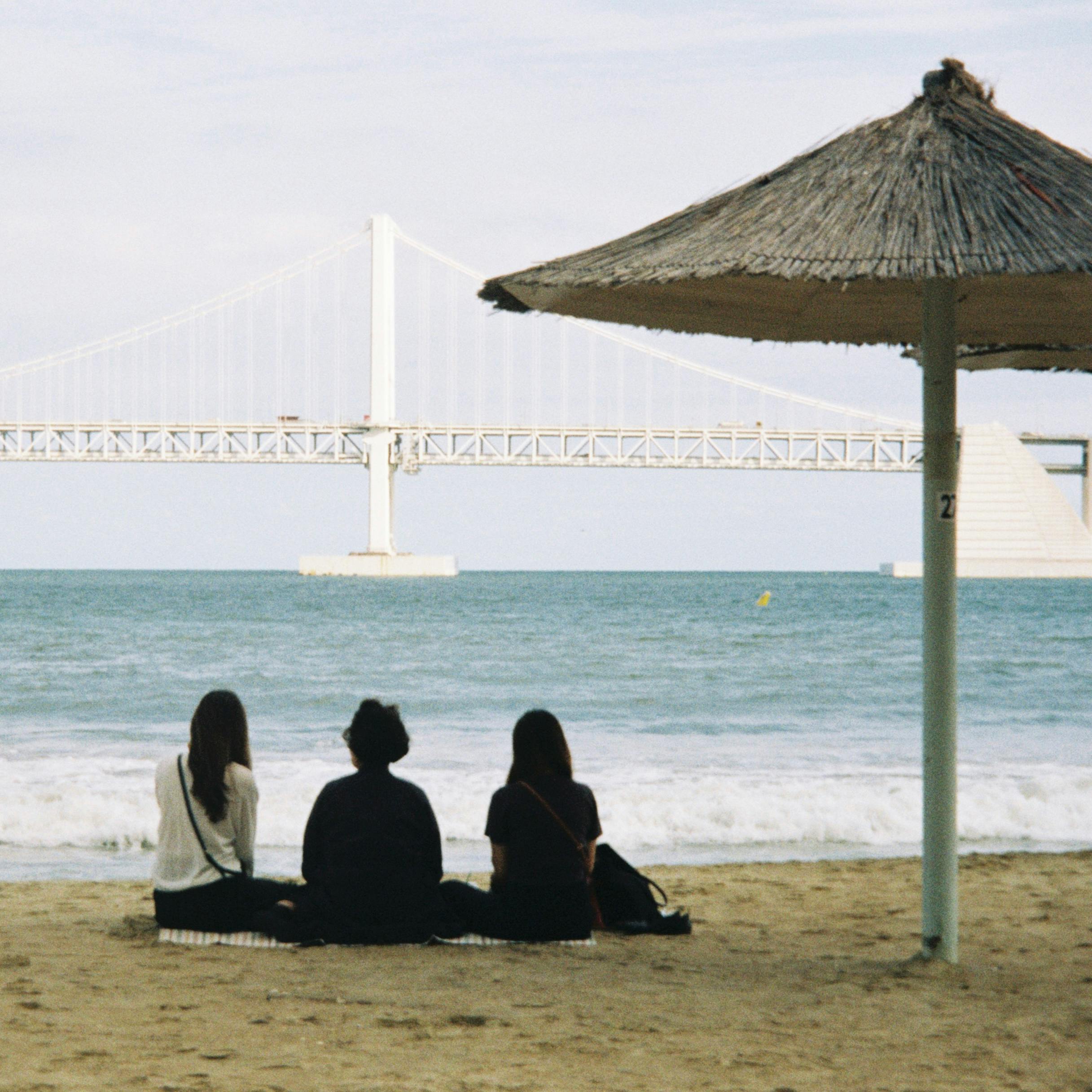 Three people enjoying a peaceful moment on a beach facing the iconic Gwangan Bridge.