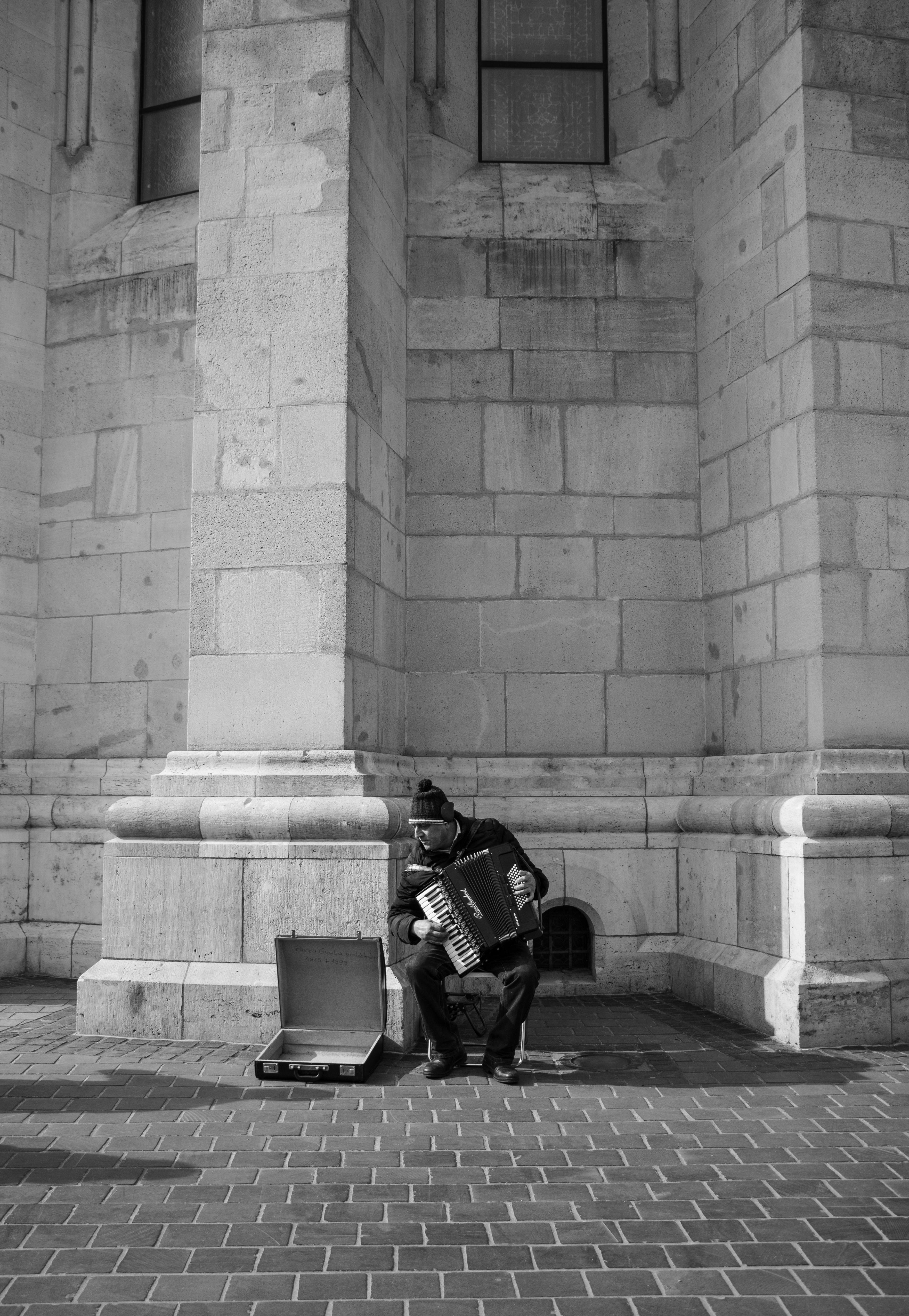 Black and white image of a busker playing accordion against a historic building in Budapest.