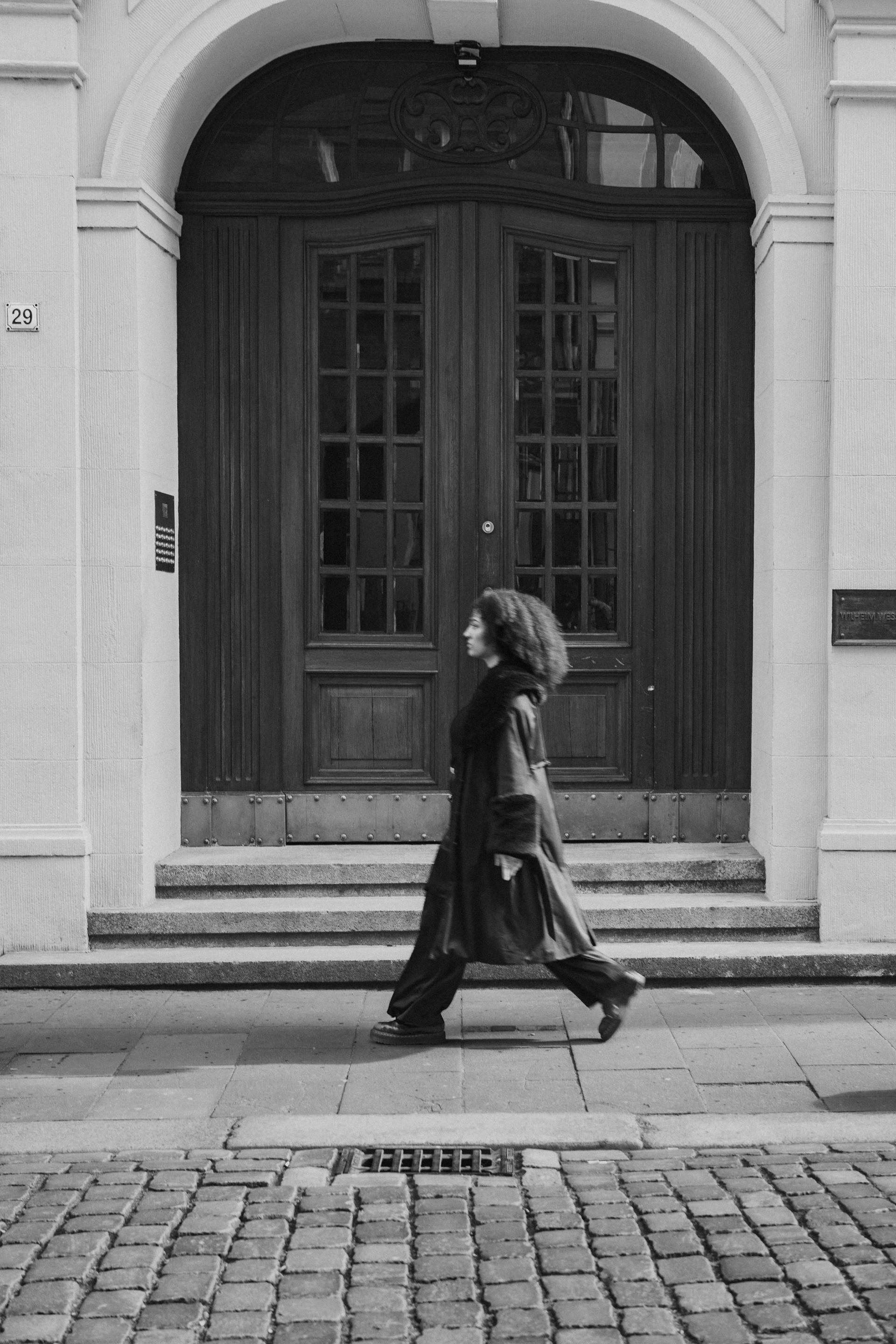 Black and white photo of a woman walking by grand wooden doors on a city street.