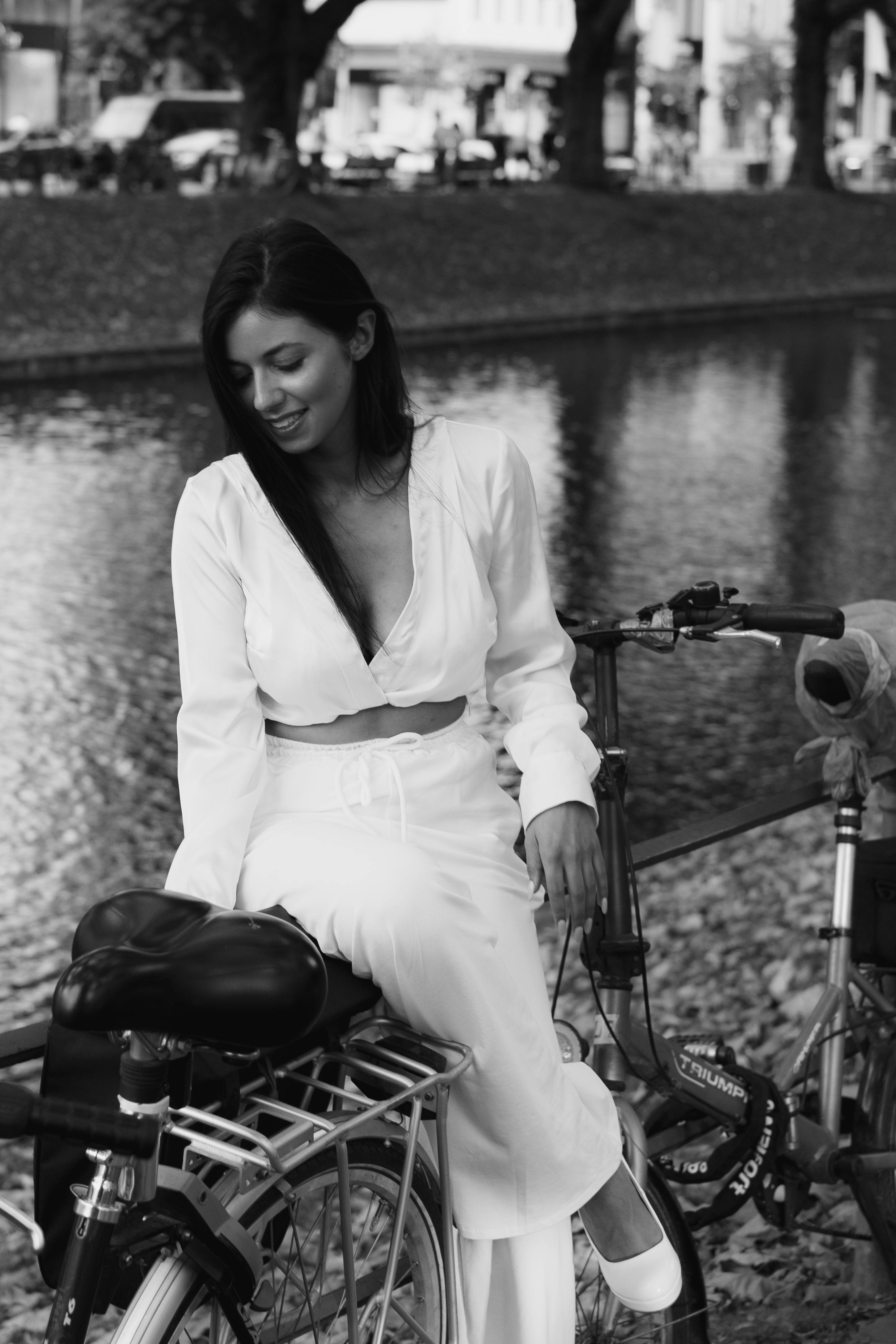 A woman in white relaxes on a bicycle by Düssel Canal, Düsseldorf, exuding elegance.