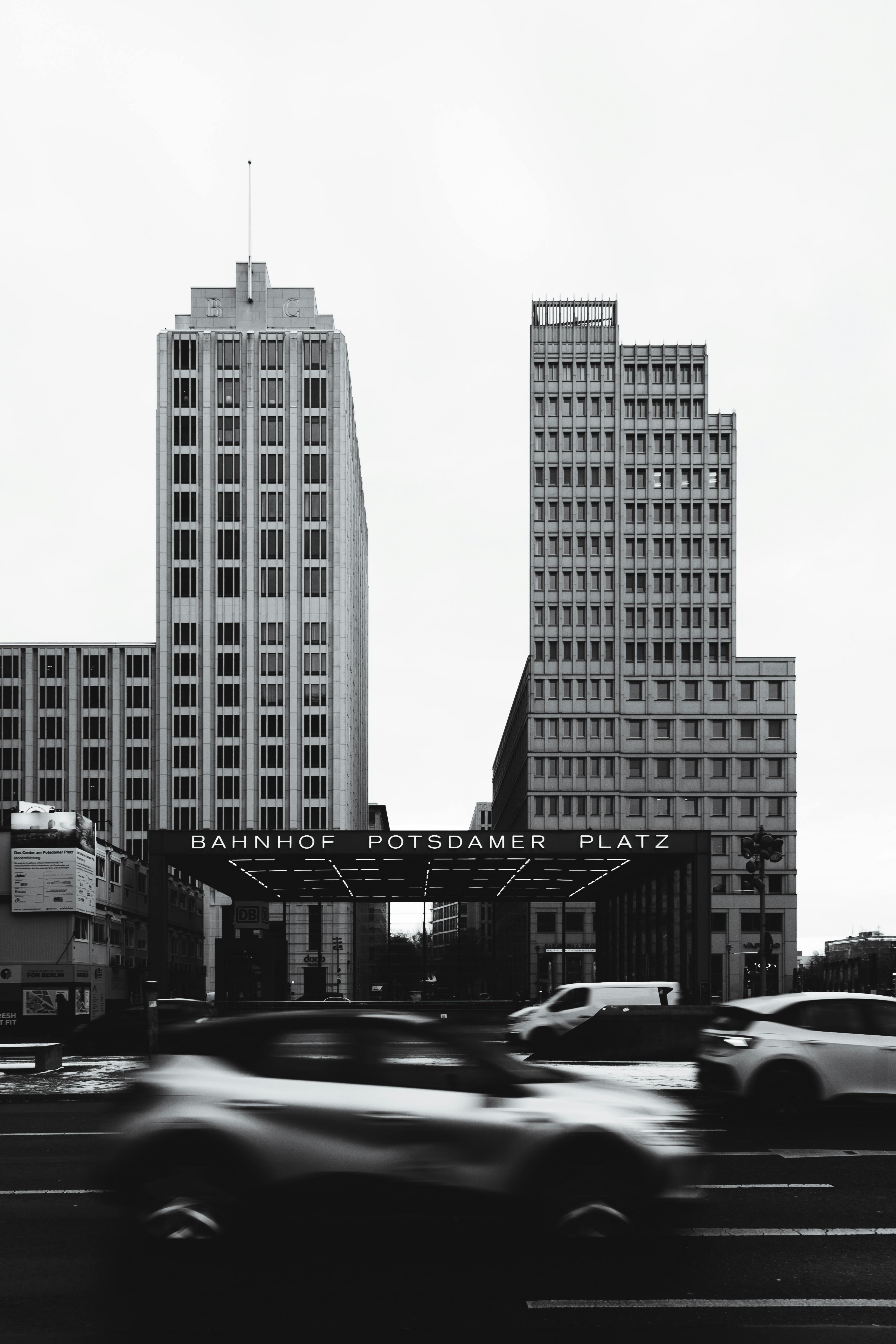 Stunning black and white shot of Potsdamer Platz, Berlin with blurred traffic.