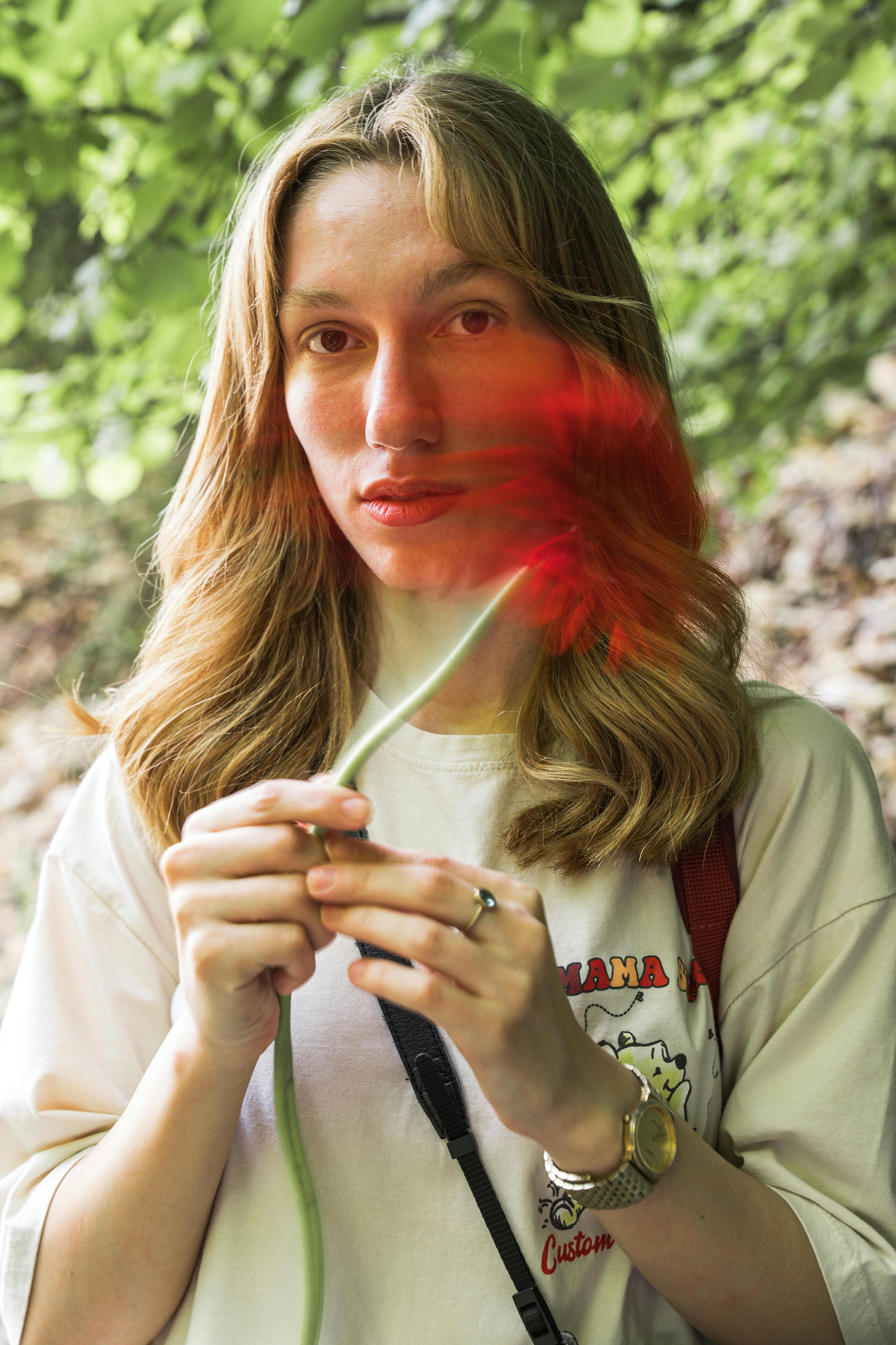 A young woman holds a flower, enjoying a peaceful day outdoors in summer.