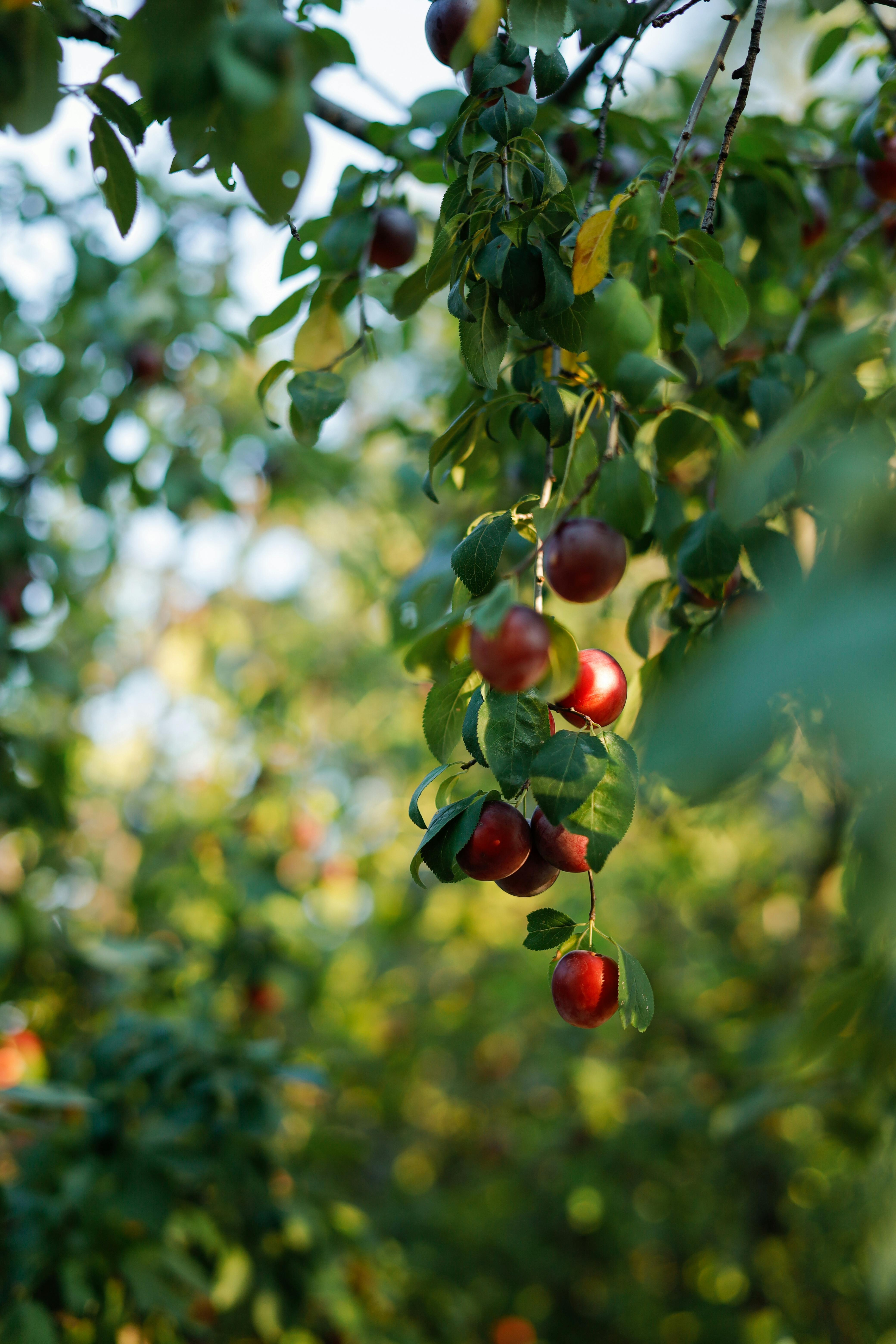Close-up of ripe apples hanging from a tree branch in a sunny orchard.