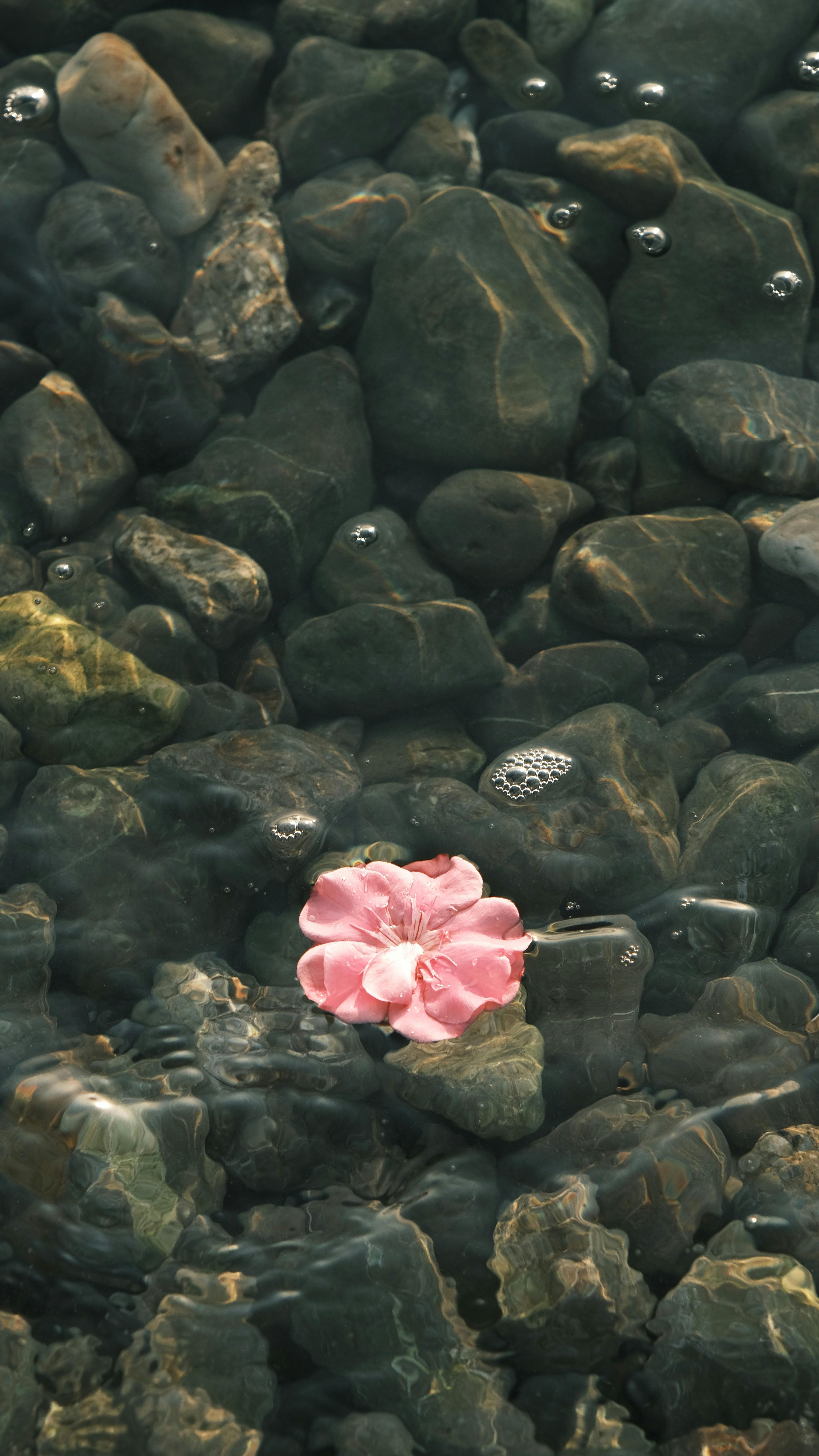 A delicate pink flower floating on water amidst smooth stones, creating a serene and zen-like atmosphere.