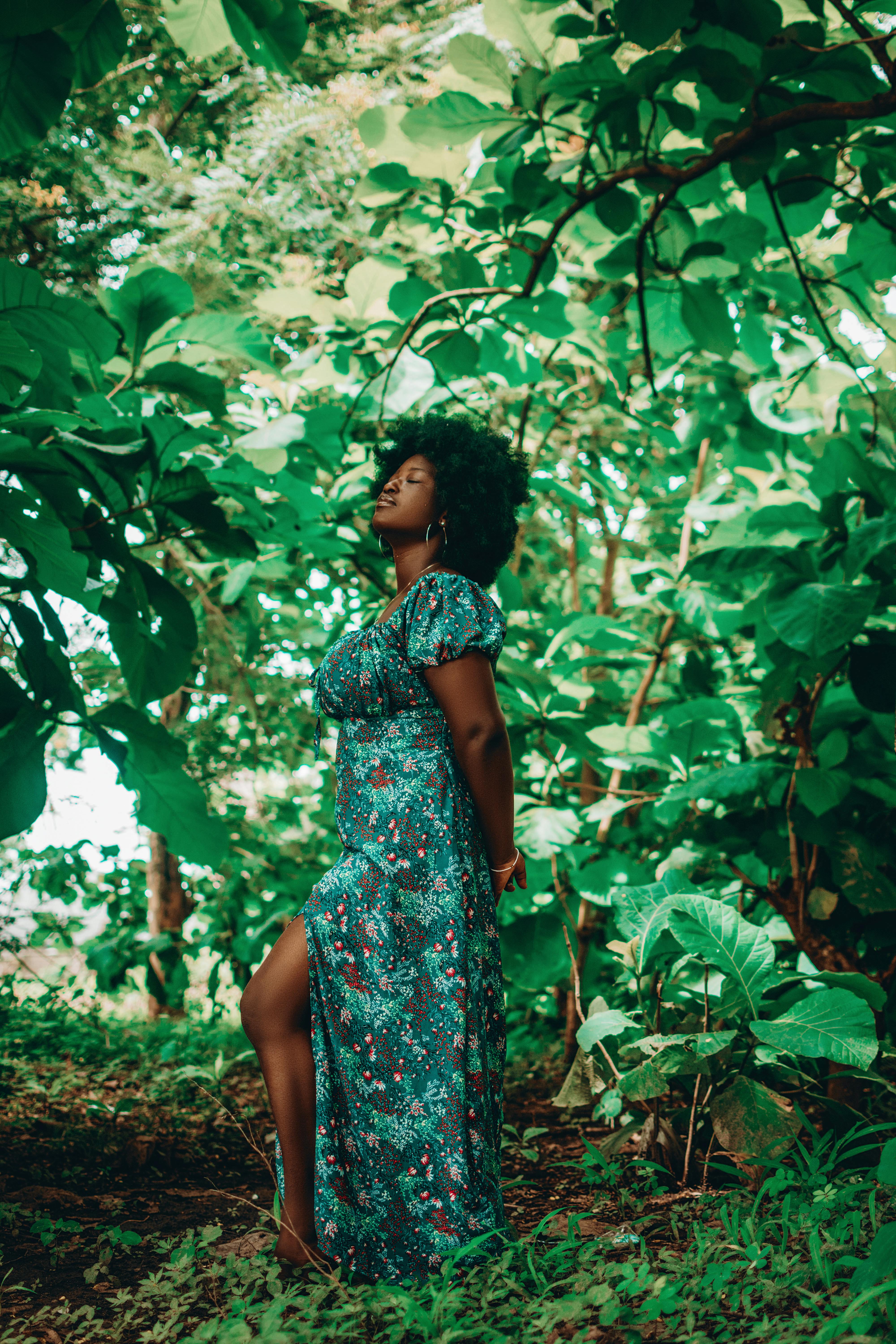 A woman in a floral dress poses gracefully in a verdant forest setting, capturing natural beauty and elegance.