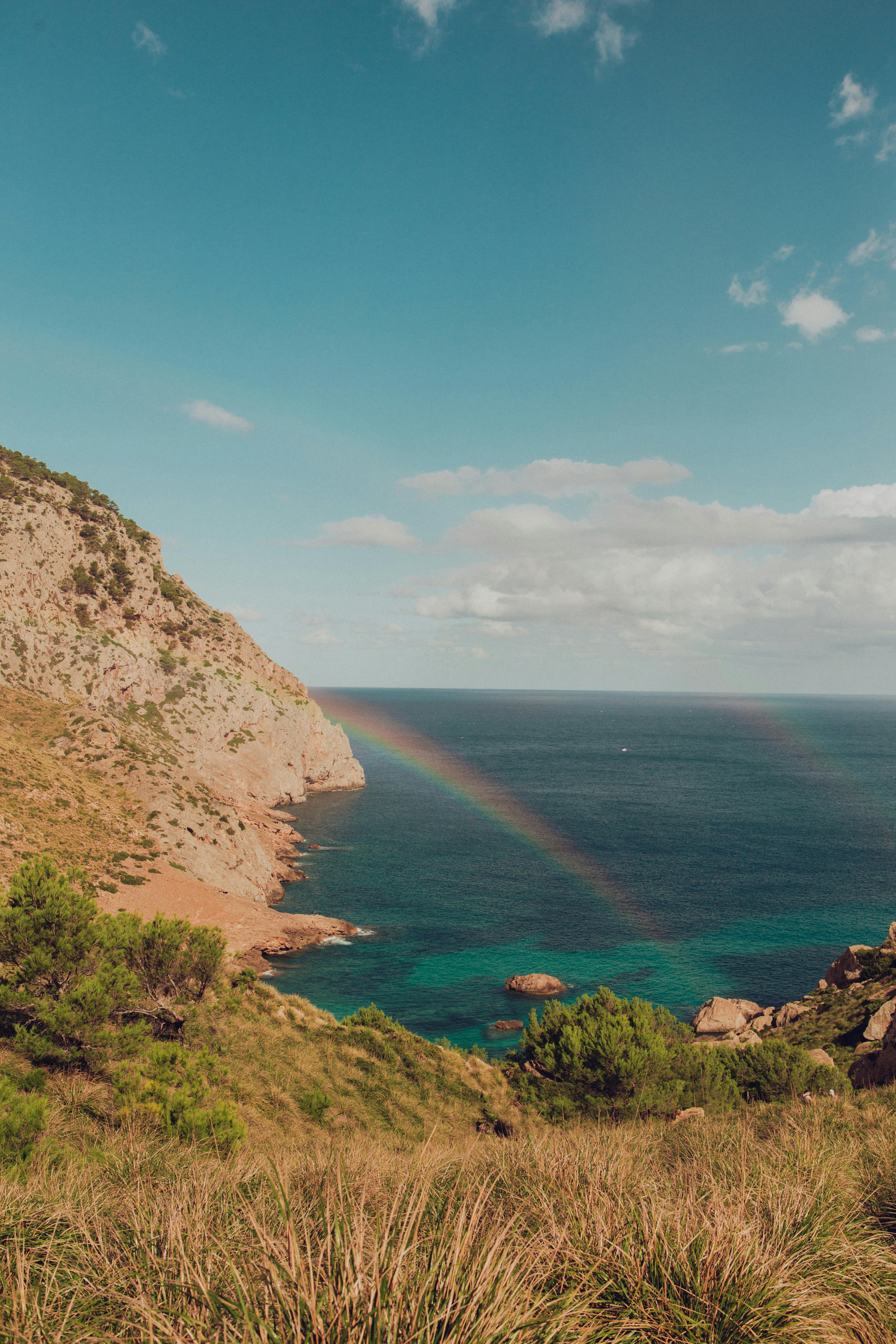 Explore the stunning Cales de Mallorca coastline with a vibrant double rainbow over the sea.