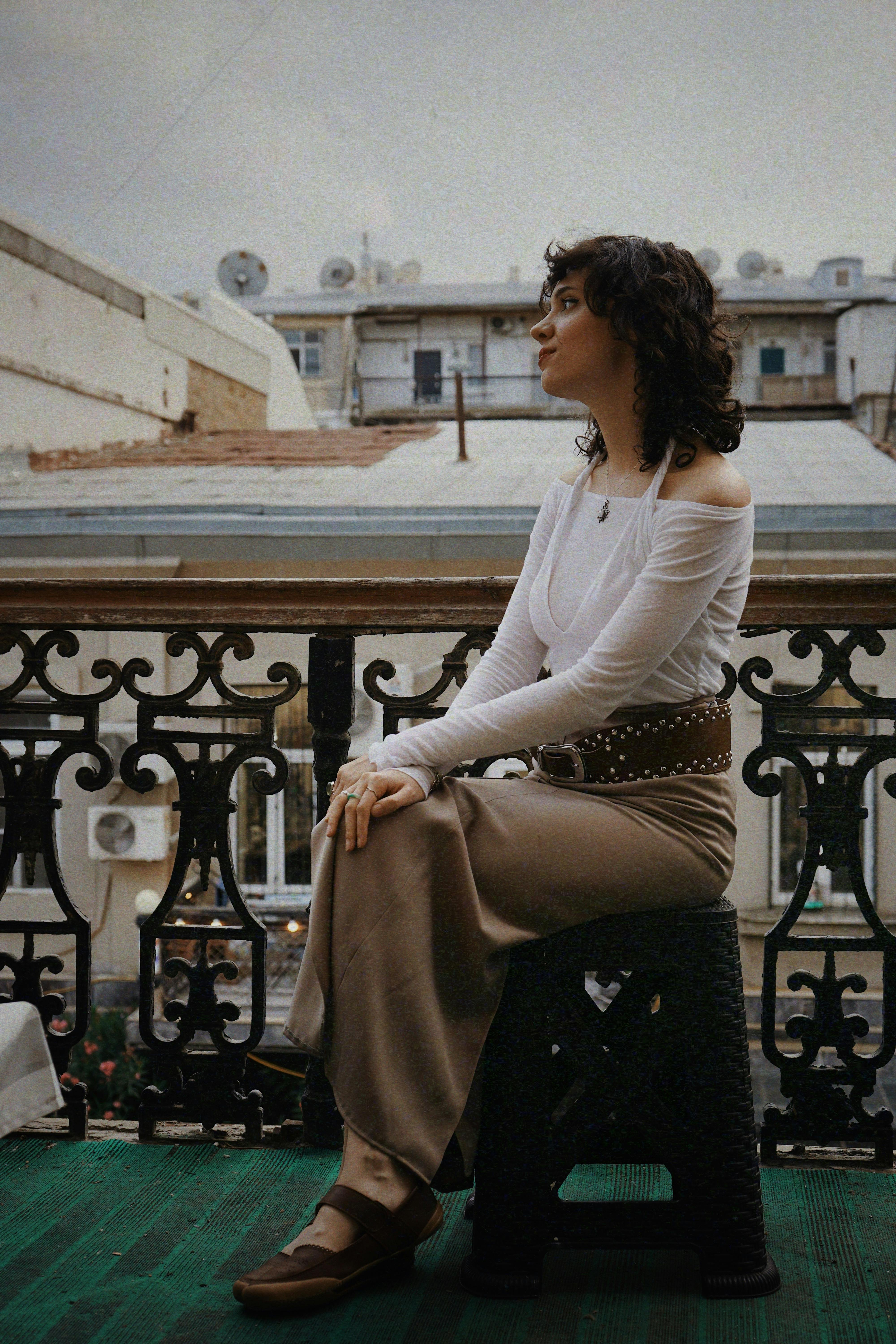 A fashionable woman in a white top and skirt sits pensively on a balcony in a city setting.