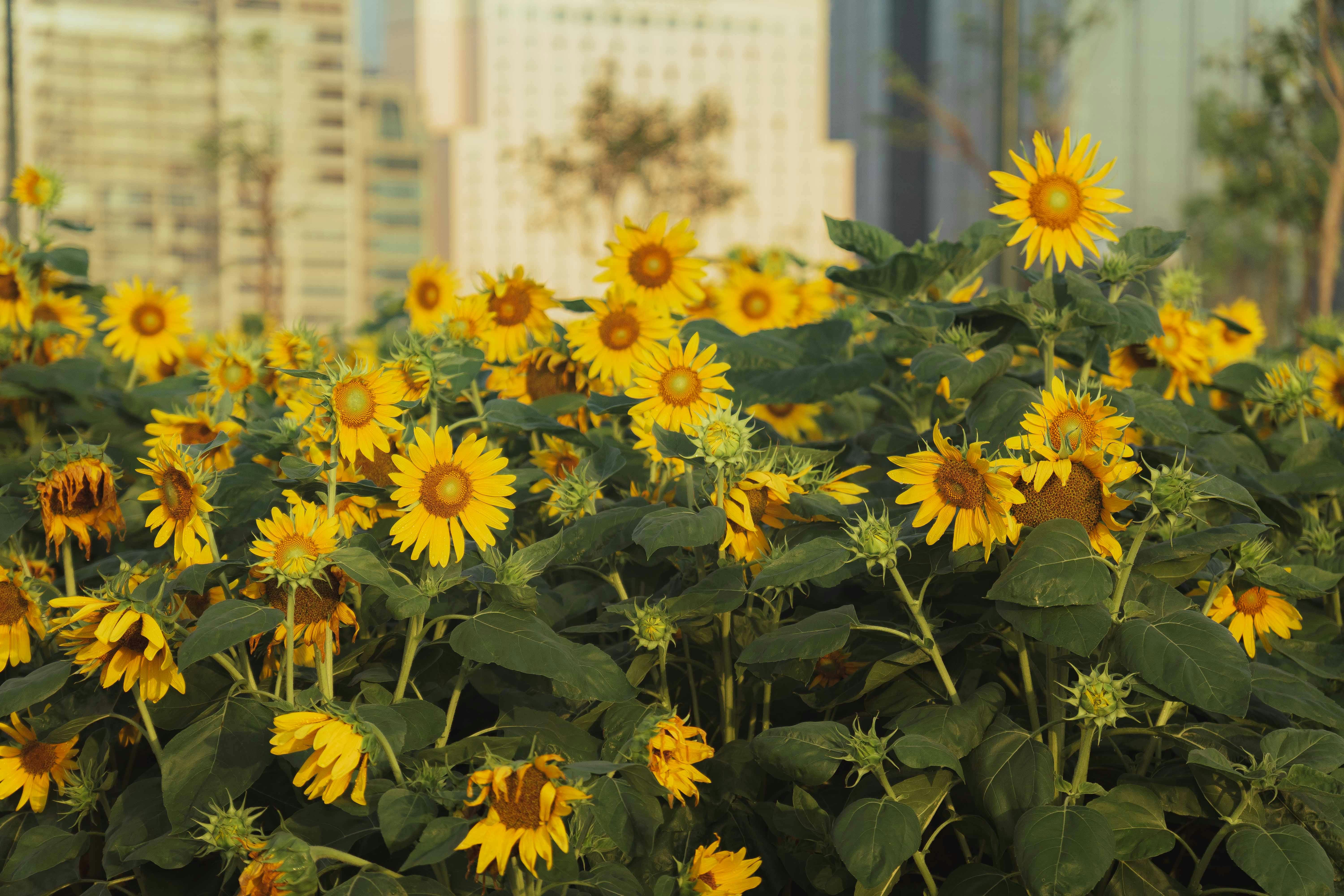 Vibrant sunflowers bloom in a city park with skyscrapers in the background.