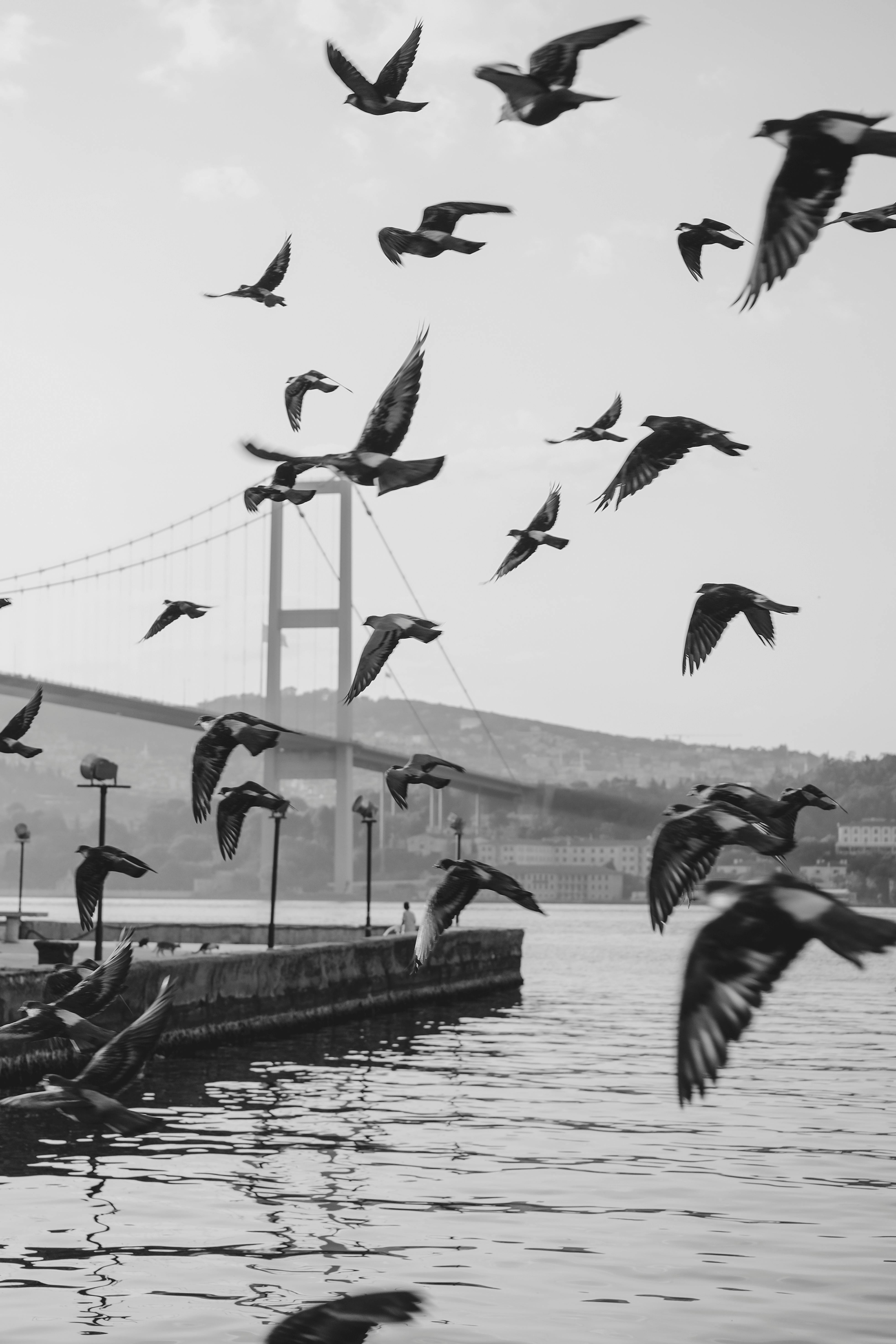A dynamic black and white photo of birds flying over water near a suspension bridge.
