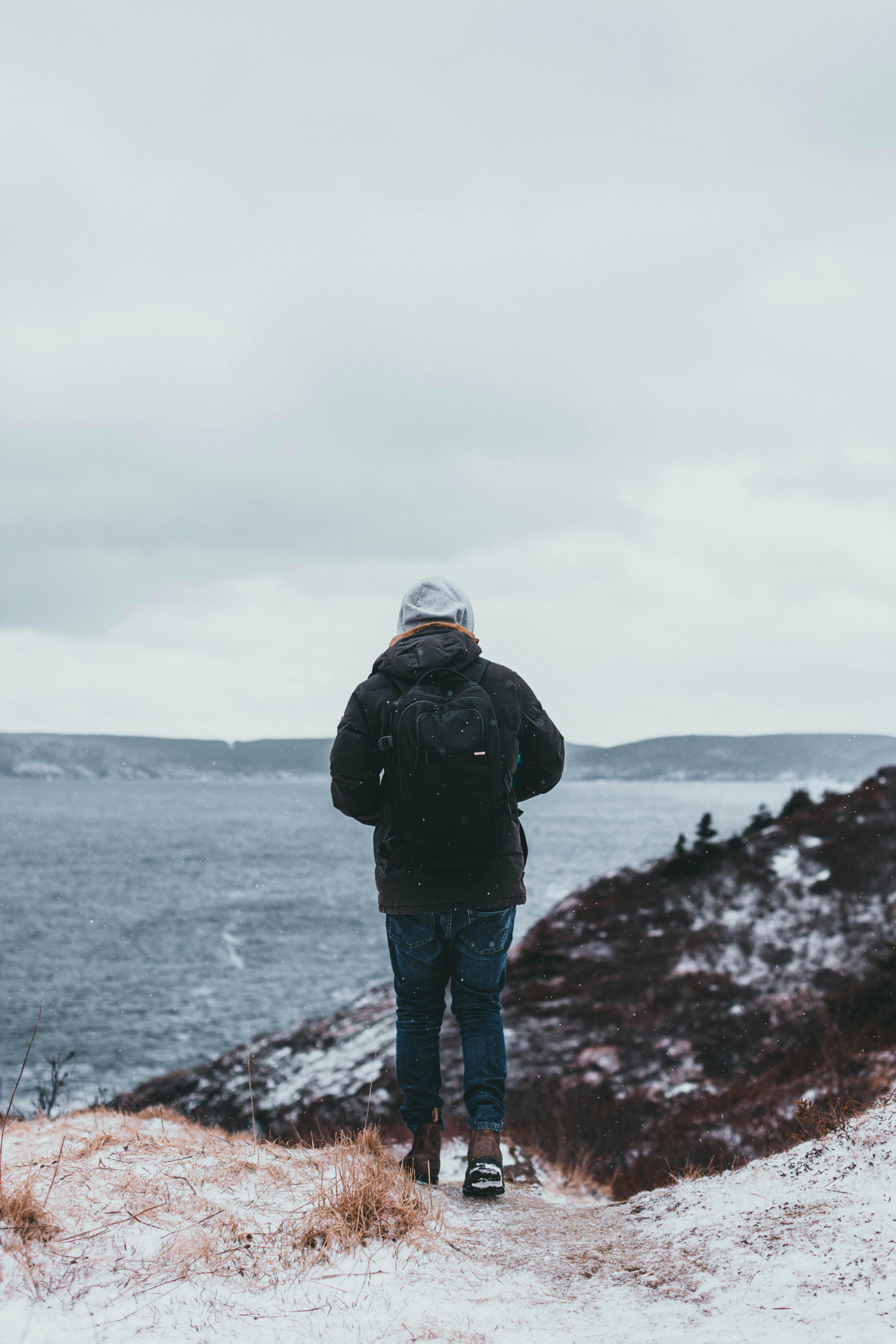 Person with backpack enjoying a snowy winter hike by the ocean.