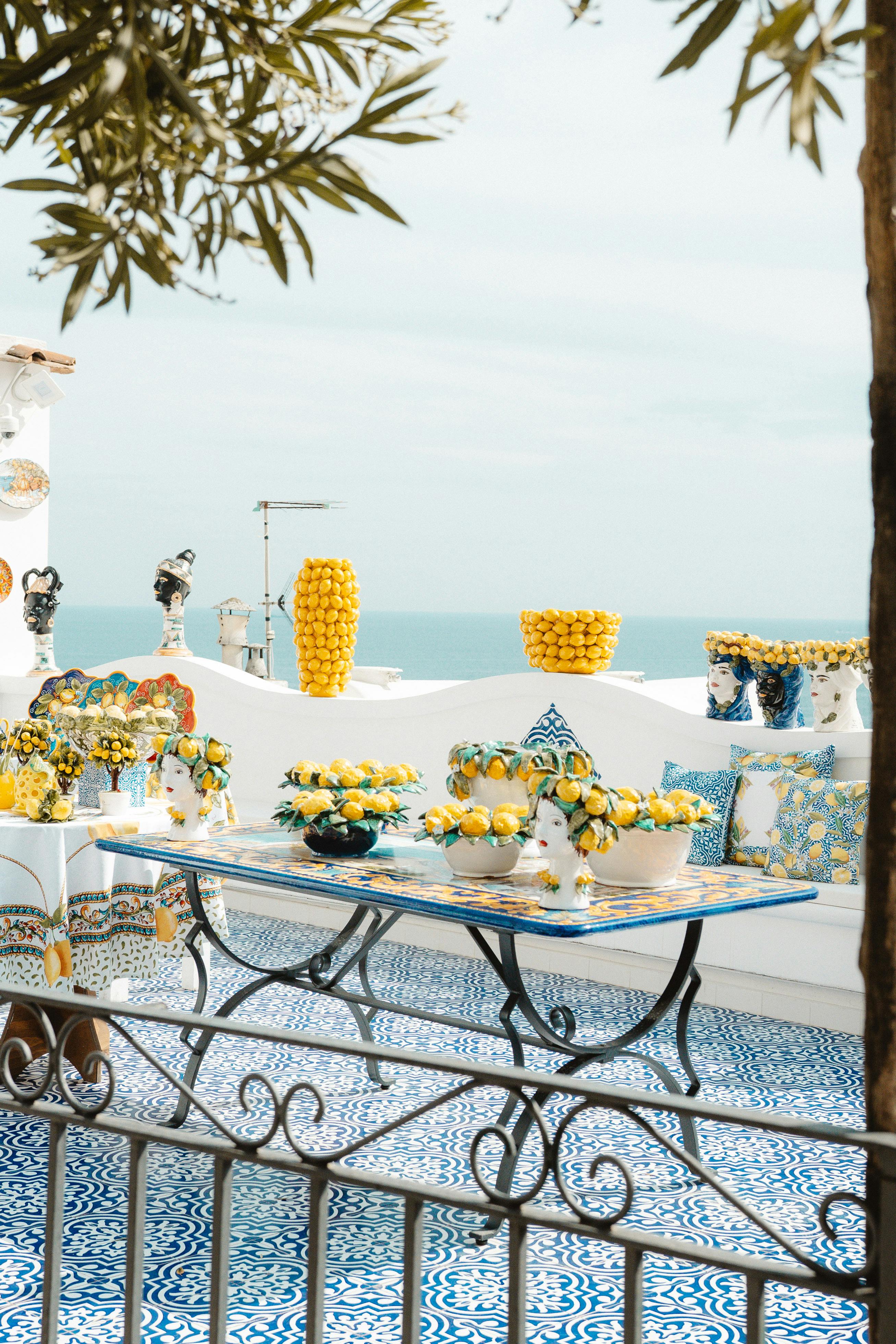 A vibrant outdoor table setting featuring lemons and Mediterranean decor on a sunny day.