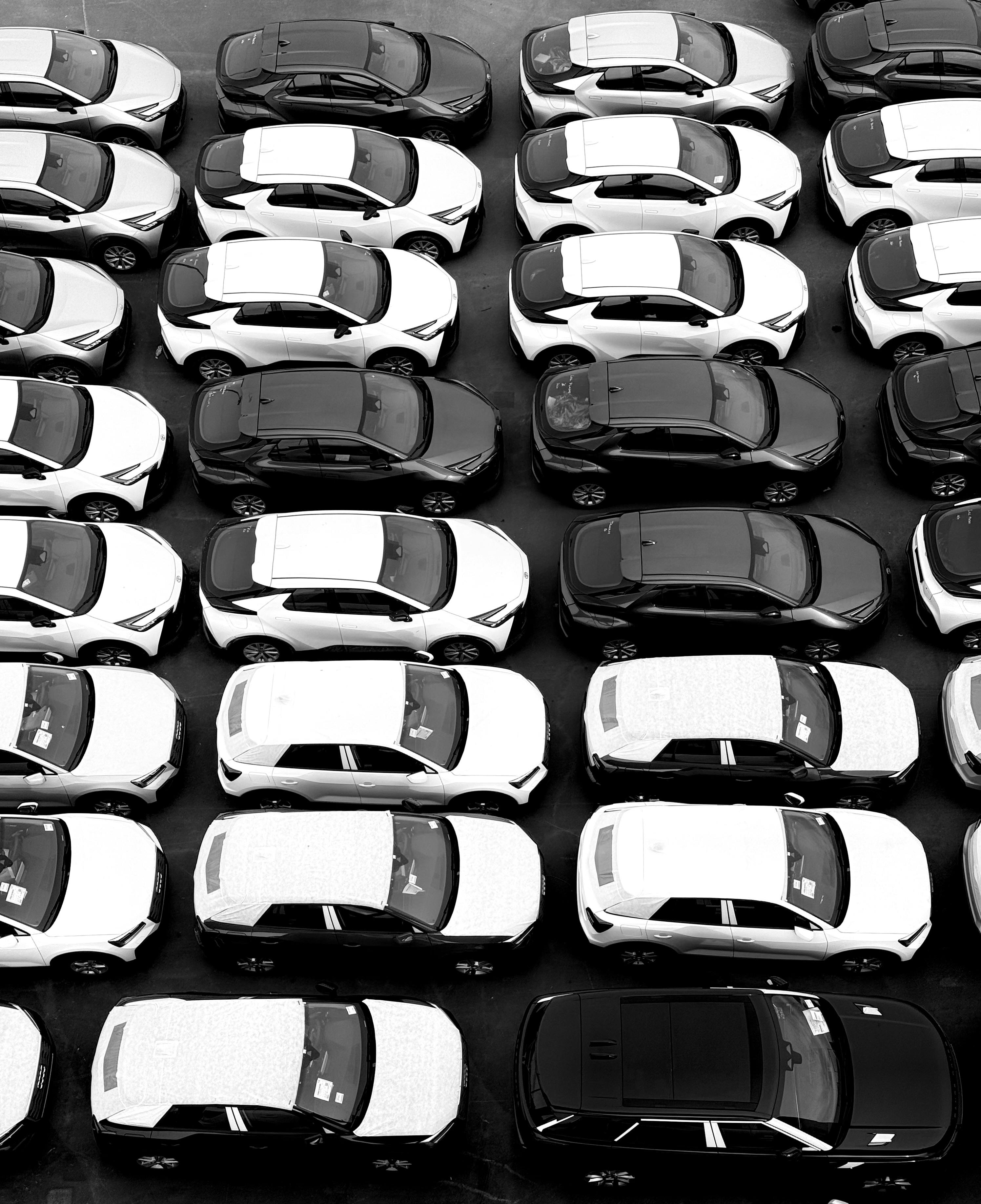 Black and white cars parked in rows from above, showcasing automotive symmetry.