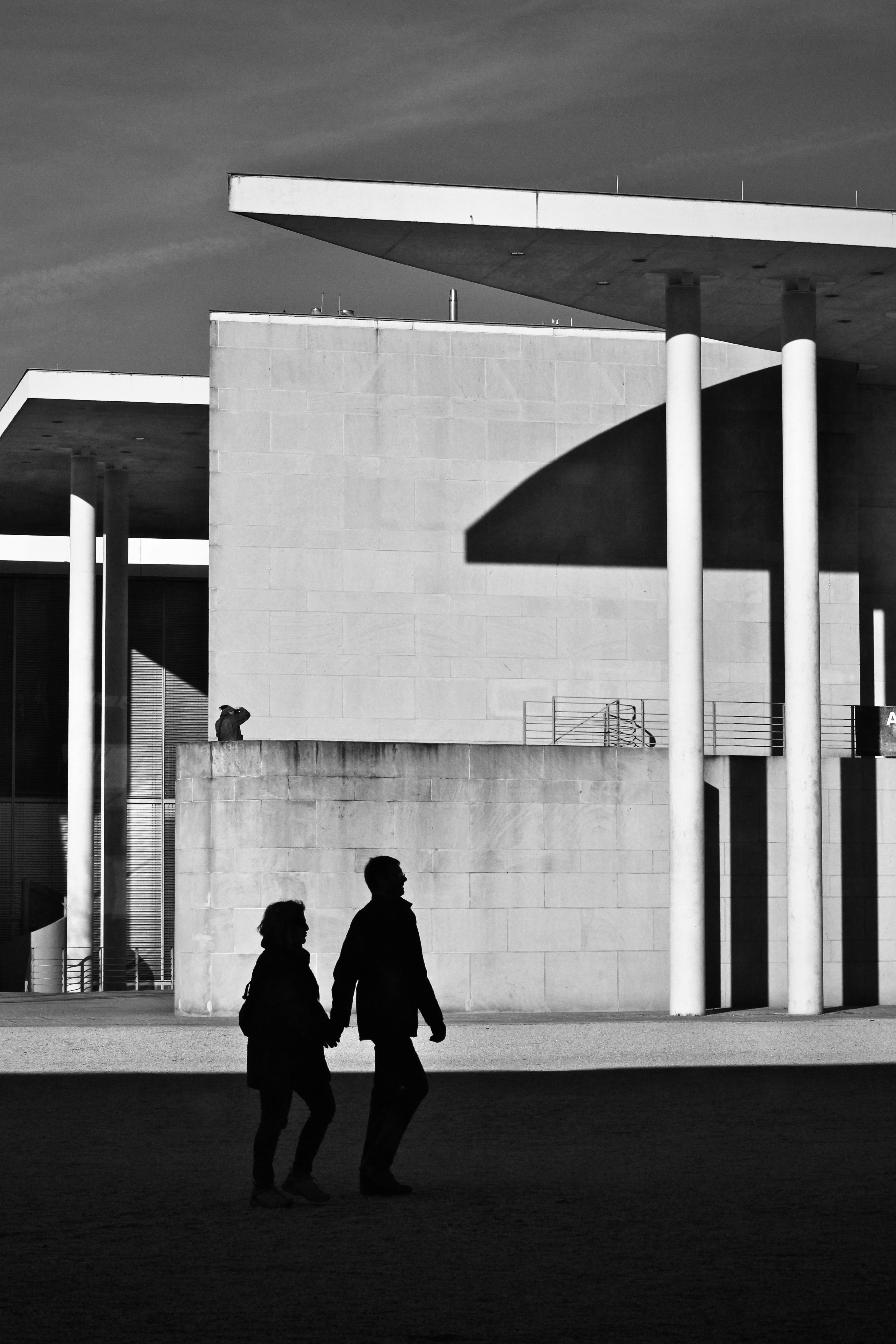 A couple walks past modern architectural structures casting dramatic shadows.