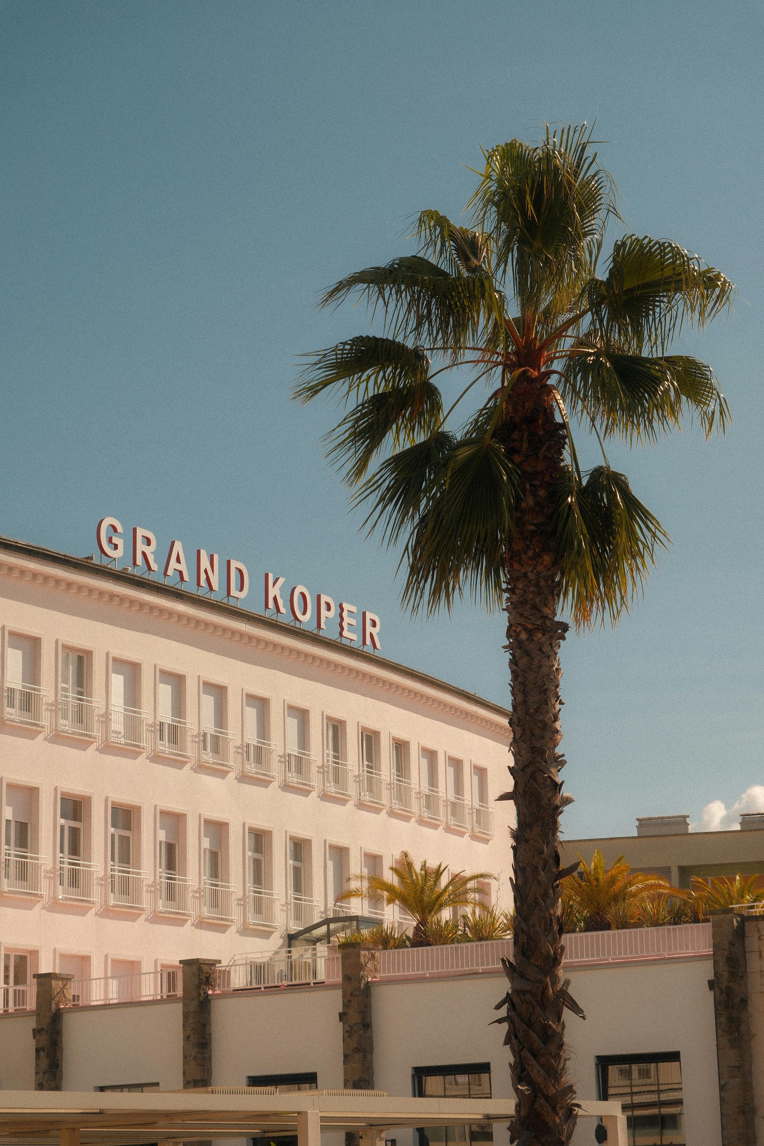 A scenic view of Grand Koper Hotel with a palm tree under a bright sky.