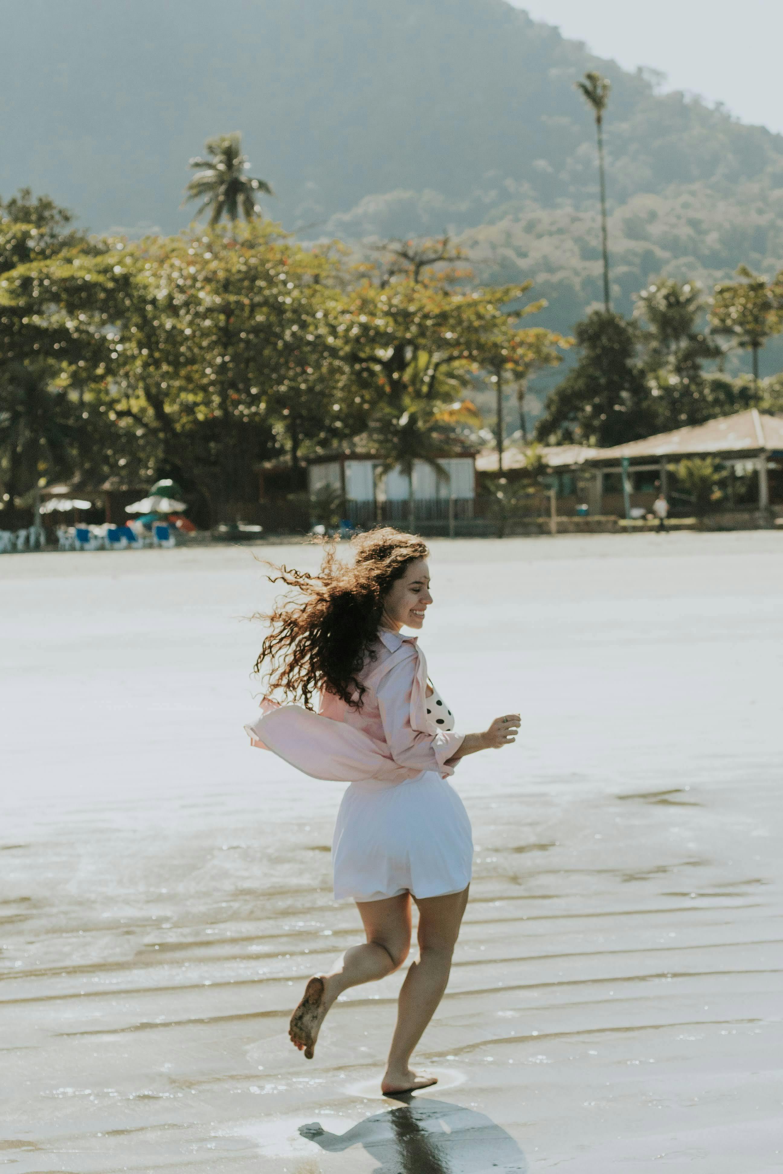 A woman in a pink shirt joyfully runs on a tropical beach with scenic mountains.