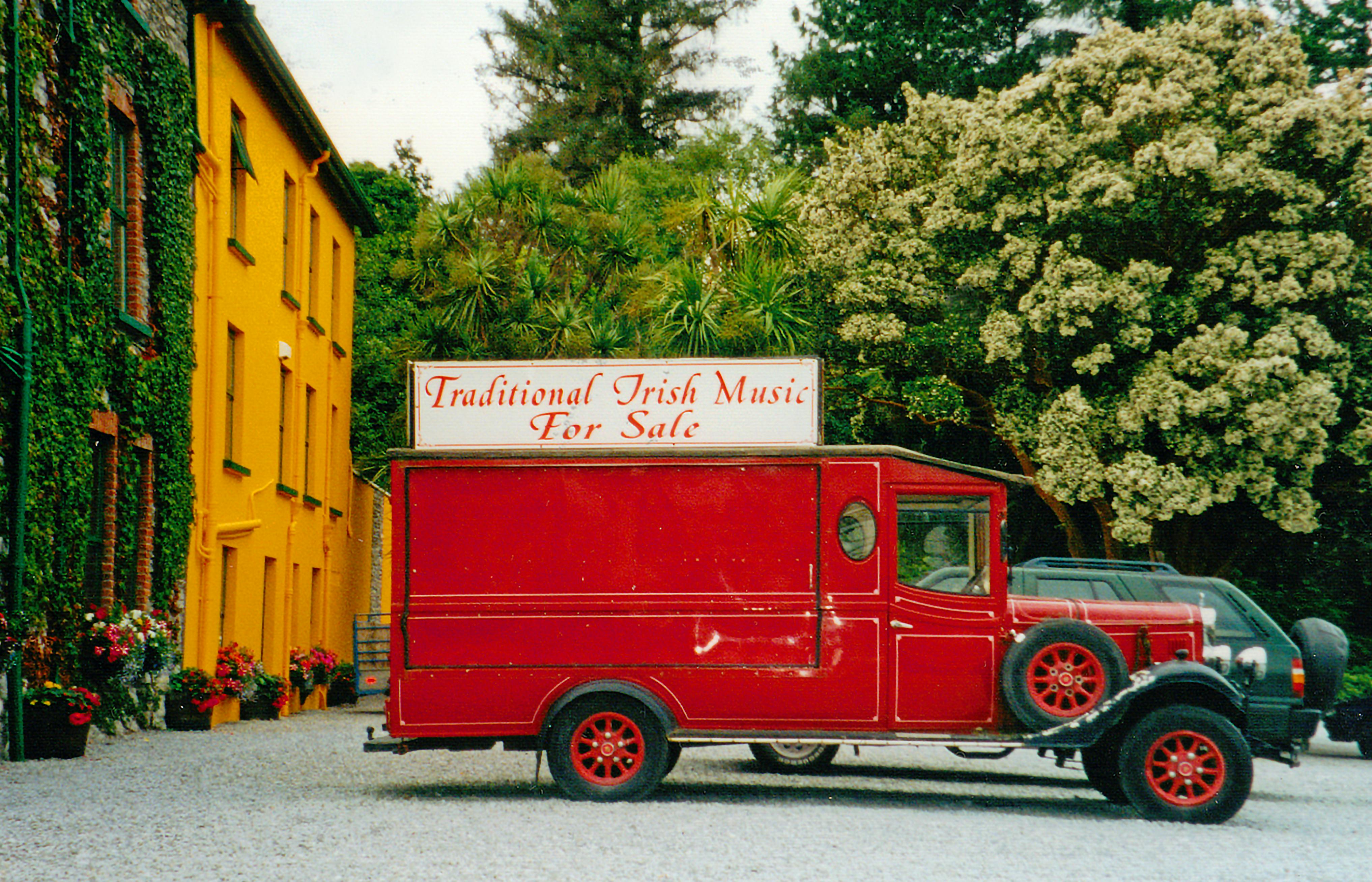 A vintage red van with a sign selling traditional Irish music parked by colorful buildings.