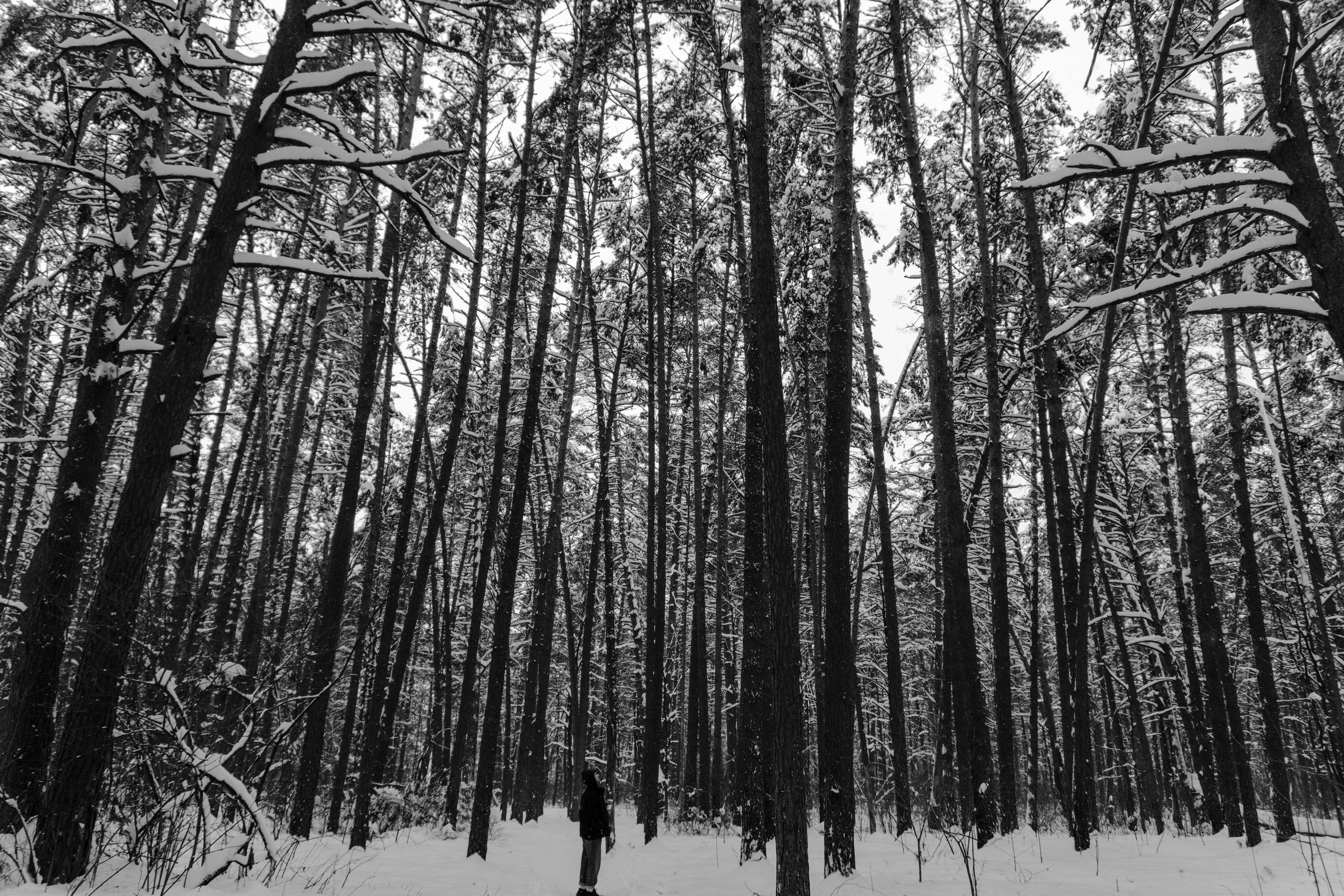 Tall snow-covered trees in a black and white winter forest setting with a lone person.