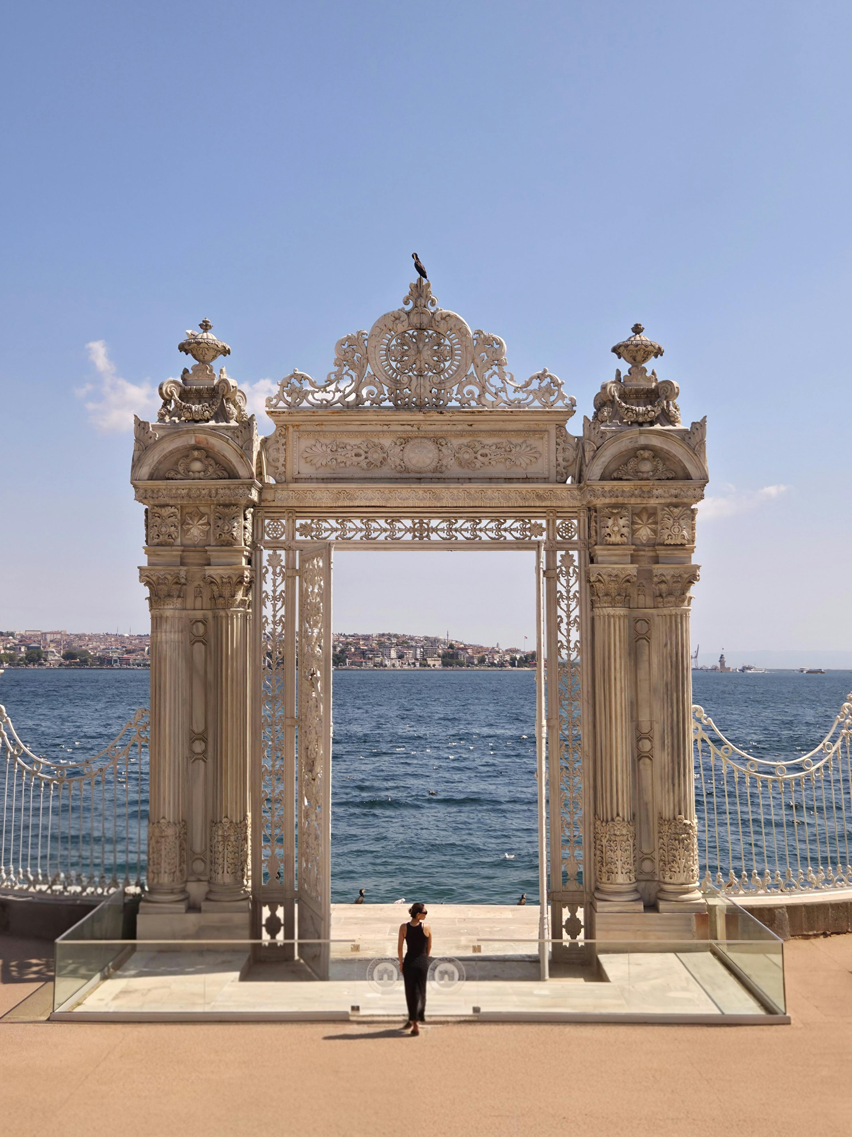 A scenic view of the ornate gate at Dolmabahçe Palace with the Bosphorus in the background.