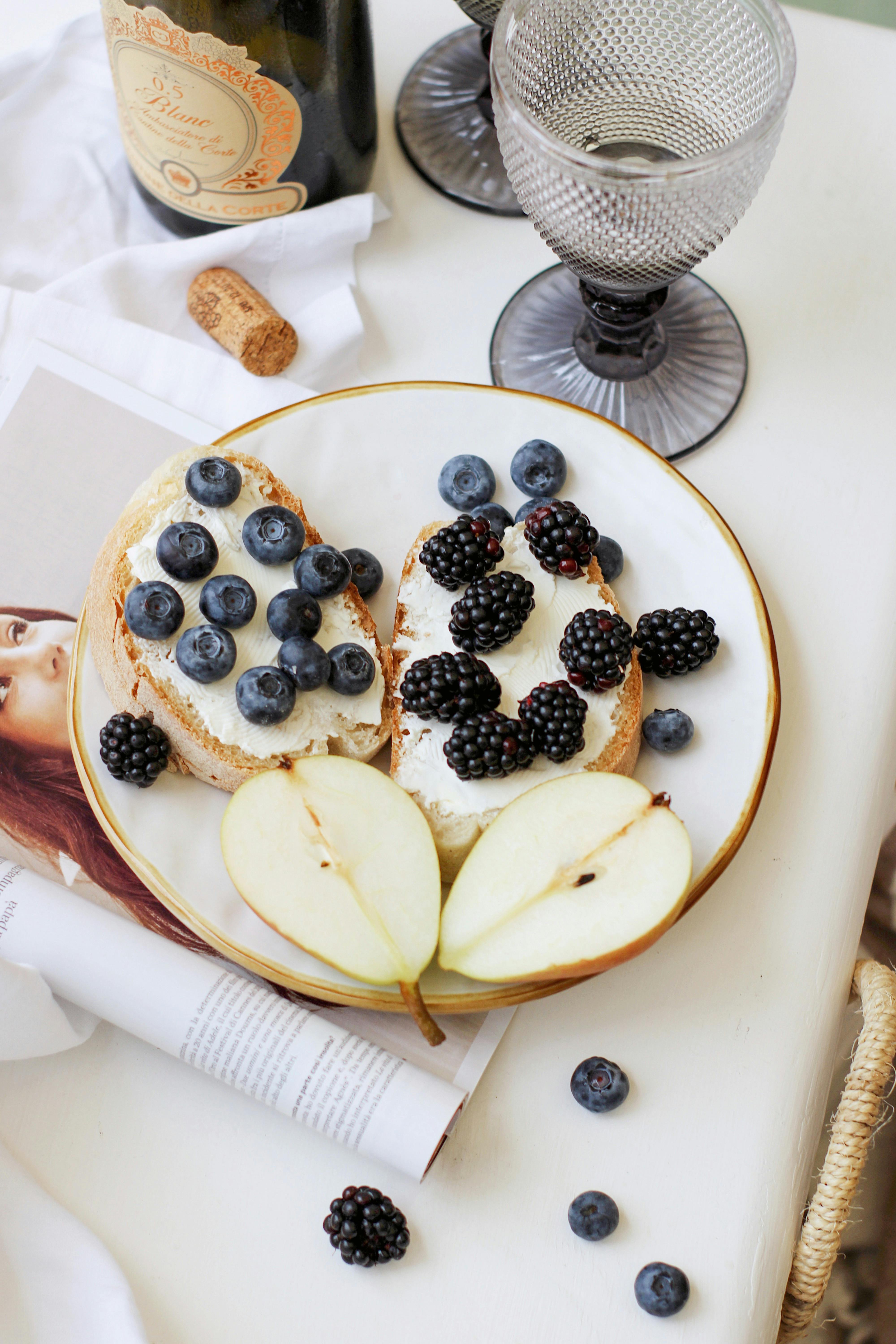 Delicious open-faced sandwich with blueberries, blackberries, and pear on a plate.