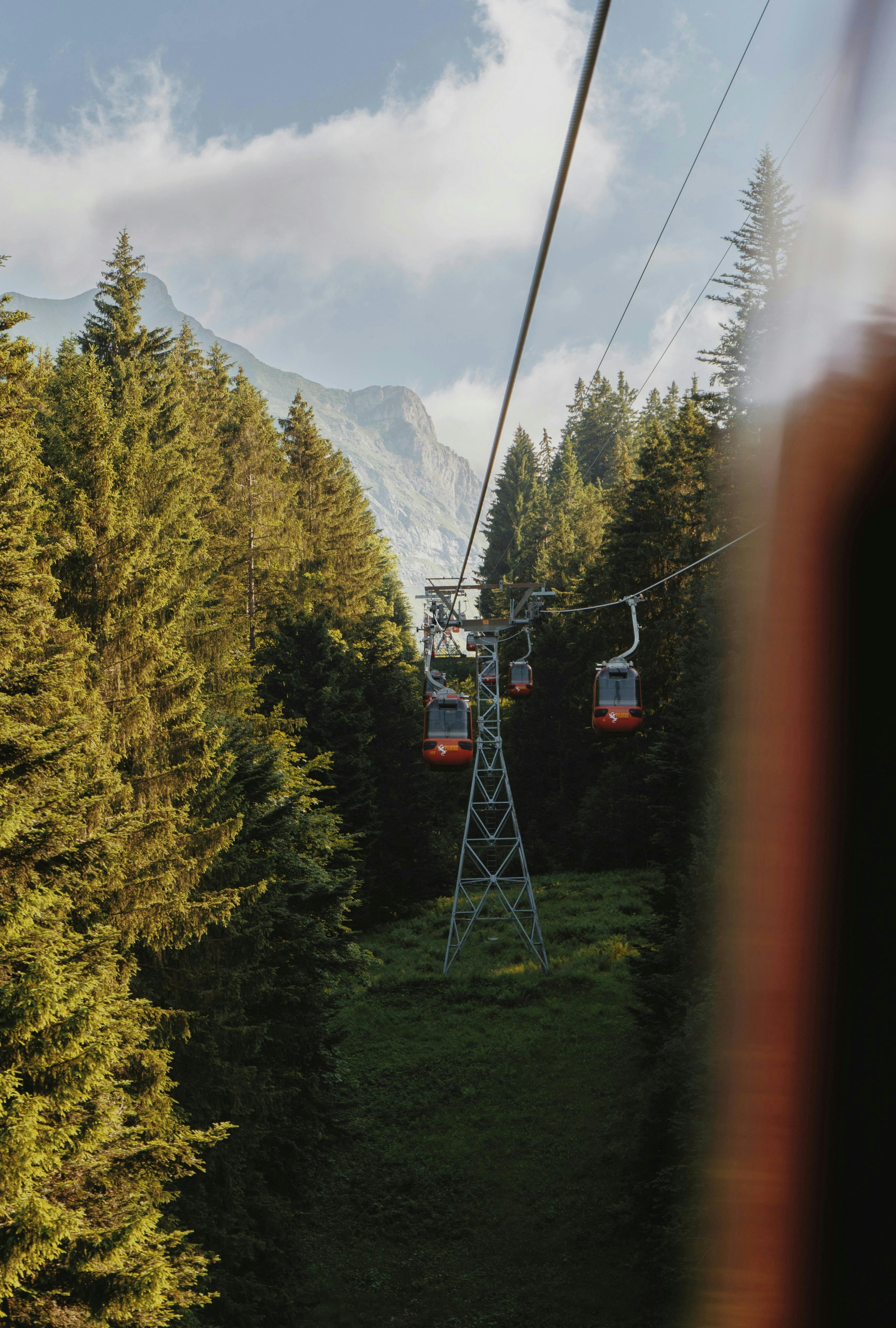 Cable cars traverse a mountainous region covered in evergreen trees under a clear sky.
