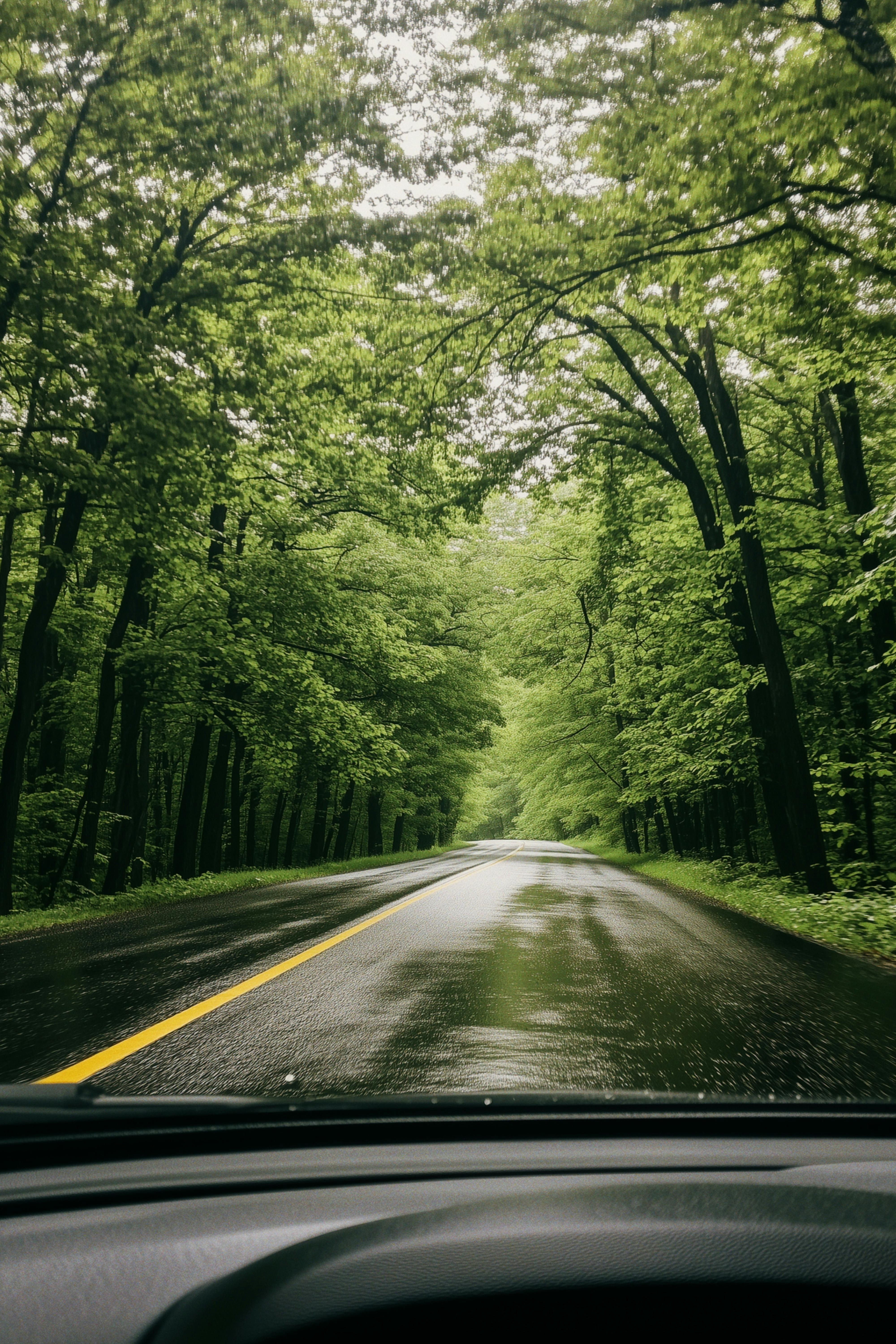 A tranquil drive through a lush green forest, showcasing a rainy day on an empty road.